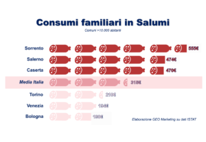 La mappa mostra i consumi delle famiglie per la categoria salumi, intesa come preparazione di carne essiccata, salata, in salamoia o affumicata.