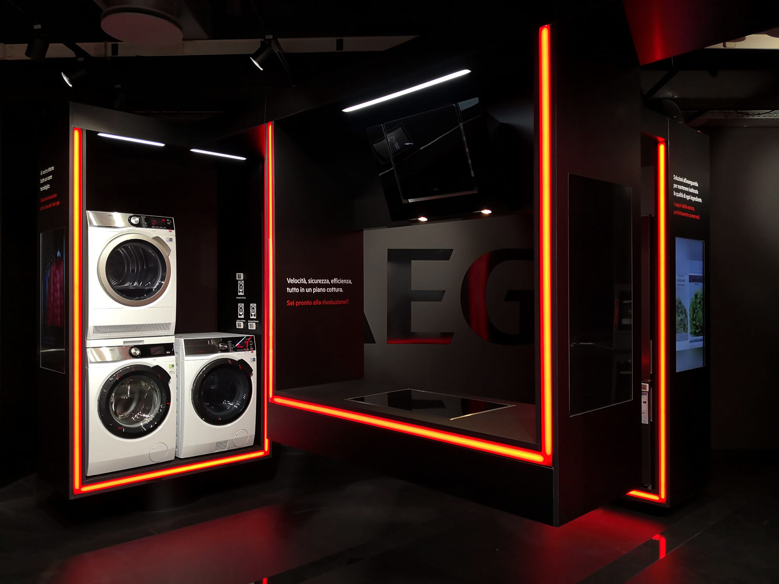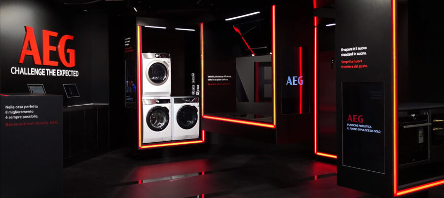 Il progetto della bottega AEG, nel punto vendita Media World di Viale Certosa a Milano progettato da Fabio Novembre, nasce dalla volontà di “rendere esperienza” il concept di comunicazione CHALLENGE THE EXPECTED ed è stato seguito da ArteficeGroup in tutte le sue fasi: dalla ideazione alla progettazione, dalla produzione dei materiali fino alla loro installazione e messa in opera. Lo spazio, di circa 50 mq, è stato pensato per integrare diverse funzioni: esposizione dei prodotti top di gamma, presenza di Brand Ambassador e manifestazioni di showcooking.