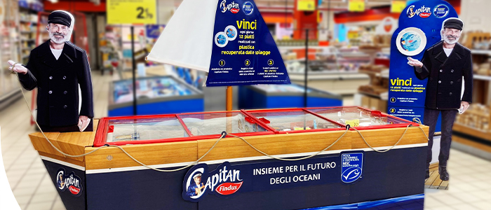 Catturare l’attenzione del consumatore, anche quello più distratto era l’obiettivo del cliente e noi lo abbiamo realizzato attraverso materiali impattanti, personaggi tridimensionali e attivatori sonori che trasportavano chiunque passasse davanti alla struttura nel mondo di Capitan Findus, su un veliero, in mare aperto, con gabbiani e vento (riprodotti sia a livello acustico sia fisico attraverso il movimento della vela).