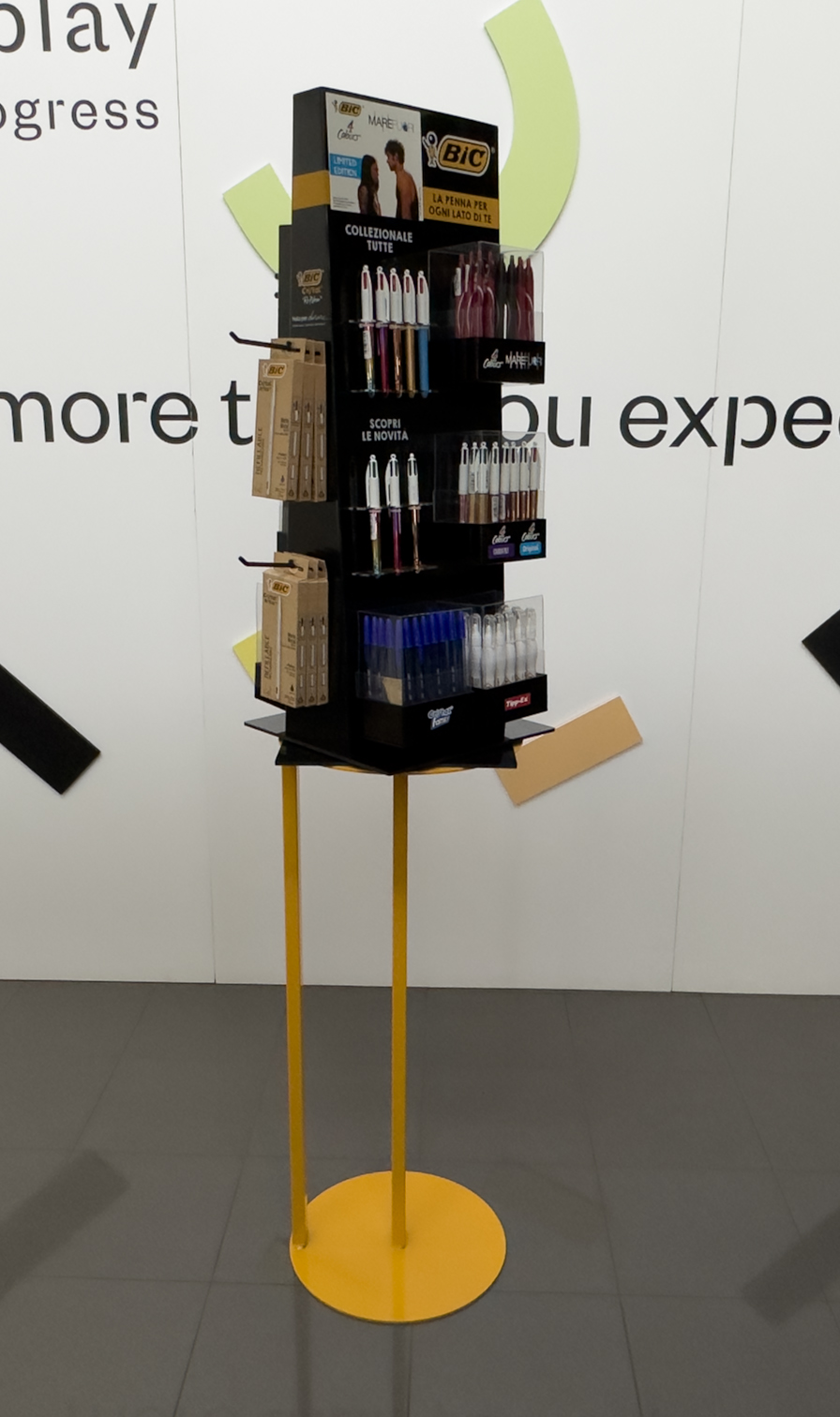 La visibilità nei negozi di cartoleria si basa su espositori da banco e strutture permanenti che riempiono banconi e scaffali. Essenziale per visibilità e assortimento, l’espositore da banco di BIC copre lo stock con un’esposizione fissa, presentando la vasta gamma di prodotti in modo premium. Distribuito in oltre il 50% delle cartolerie italiane, permette di mixare le 6 gamme principali, con colori e strumenti vari, offrendo al consumatore l’opzione di esprimere stile e personalità. Strutturato a cavalletto e girevole, include cassetti ganci e tester su pannelli e spazi per logo, claim, blister. La sostenibilità, richiesta nel brief, ha portato alla scelta di un espositore monomateriale, 100% riciclato e riciclabile, rispettando l’immagine premium del brand e semplificando il recupero dei materiali. L’imballo, in cartone FSC® riciclato e riciclabile, è protetto da un sistema a doppia camera che evita l’uso di plastica o polistirolo espanso.