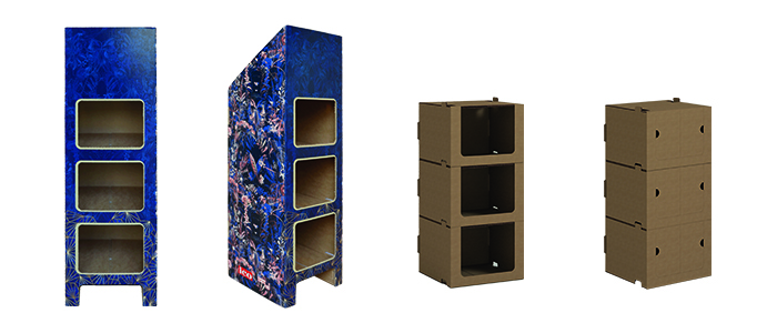 Sia le casse che il fustellato (cover) sono realizzate con accorgimenti che le rendano solidali tra loro, una volta sovrapposte, e con la cover, aumentandone la stabilità.