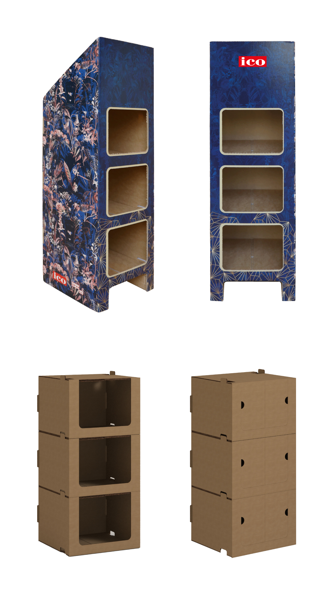 Nel COVER Display box-on-box® le scatole da trasporto del prodotto sono una parte dell’espositore e, una volta impilate, verranno “vestite” con un fustellato che potrà essere personalizzato a piacimento.