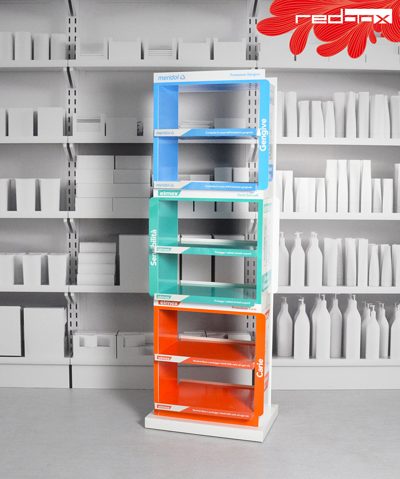 Un espositore da terra durevole riutilizzabile. Grazie alla vestizione intercambiabile è possibile