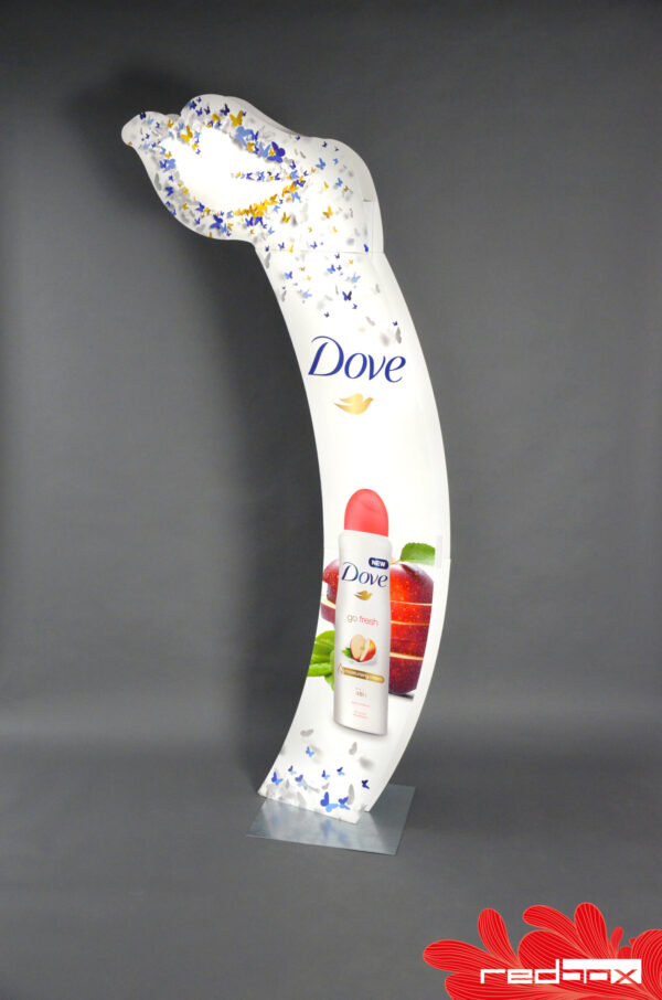 The promotional island is made of cardboard in layers, glued by hand. It’s equipped with a lighting
