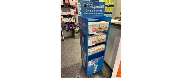 Sostenibilità e riduzione impatto ambientale sono alla base della nuova flotta di espositori durevoli Enterogermina, progettate in due versioni: piccolo (4 scaffali) e grande (5 scaffali).