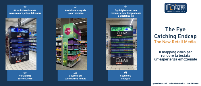 L’Eye Catching Endcap, soluzione ideata da Intertouch, integra schermi di ultima generazione ad alta risoluzione, tecnologie IoT e una piattaforma di marketing signage che dialoga con il consumatore nel momento della decisione di acquisto.