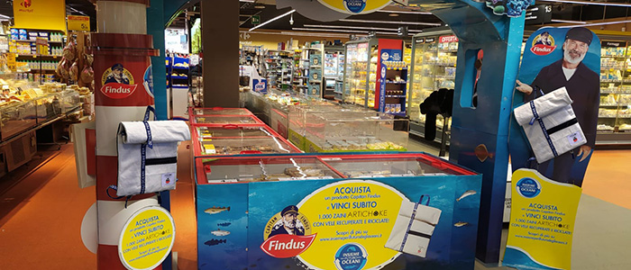 A supporto della consumer promo di Capitan Findus “Insieme per il futuro degli oceani” che ha avuto focus di comunicazione on-pack e media nel Q1 2022 si è voluta ricreare un’ambientazione marina all’interno dei punti vendita attraverso l’allestimento delle vasche promozionali extra-display.
