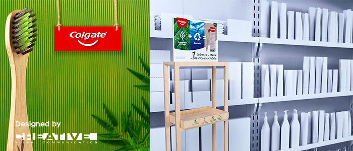La finalità del progetto è comunicare i valori della nuova gamma di prodotti eco Colgate anche tramite un display realizzato con materiali ecologici.