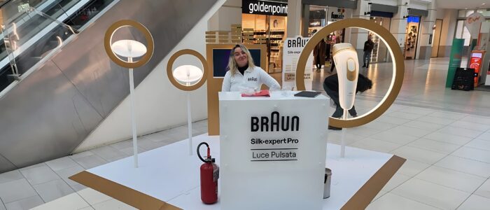 Dal cliente è stata richiesta l’ideazione di un’isola da inserire nelle gallerie commerciali di dimensione non maggiore di 4mtx4mt. La richiesta era di comprendere un desk per le promoter e teche espositive del prodotto ed educazionali allo stesso, oltre all’intergrazione di spazi monitor per aggiungere materiale promozionale al lancio del prodotto.