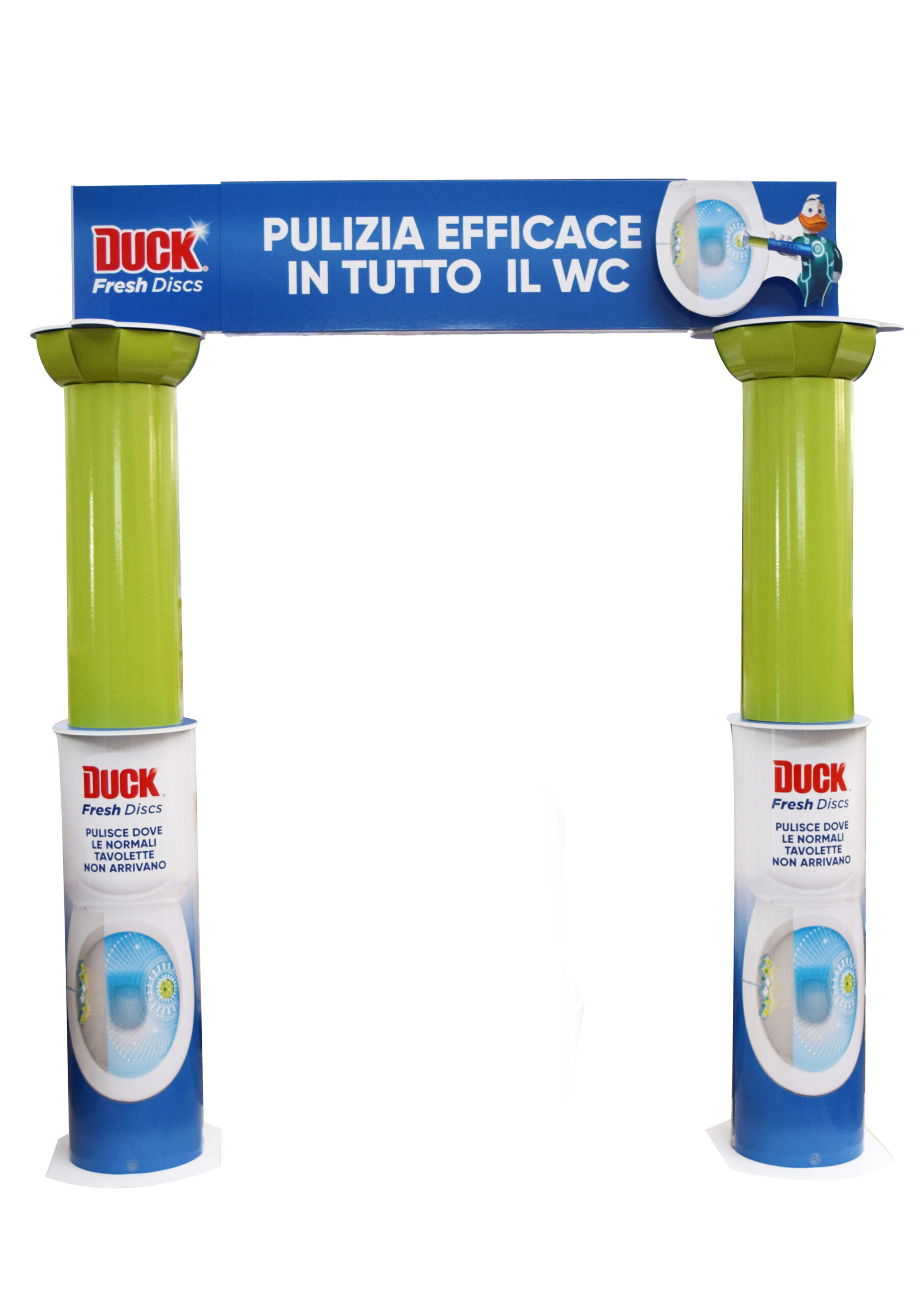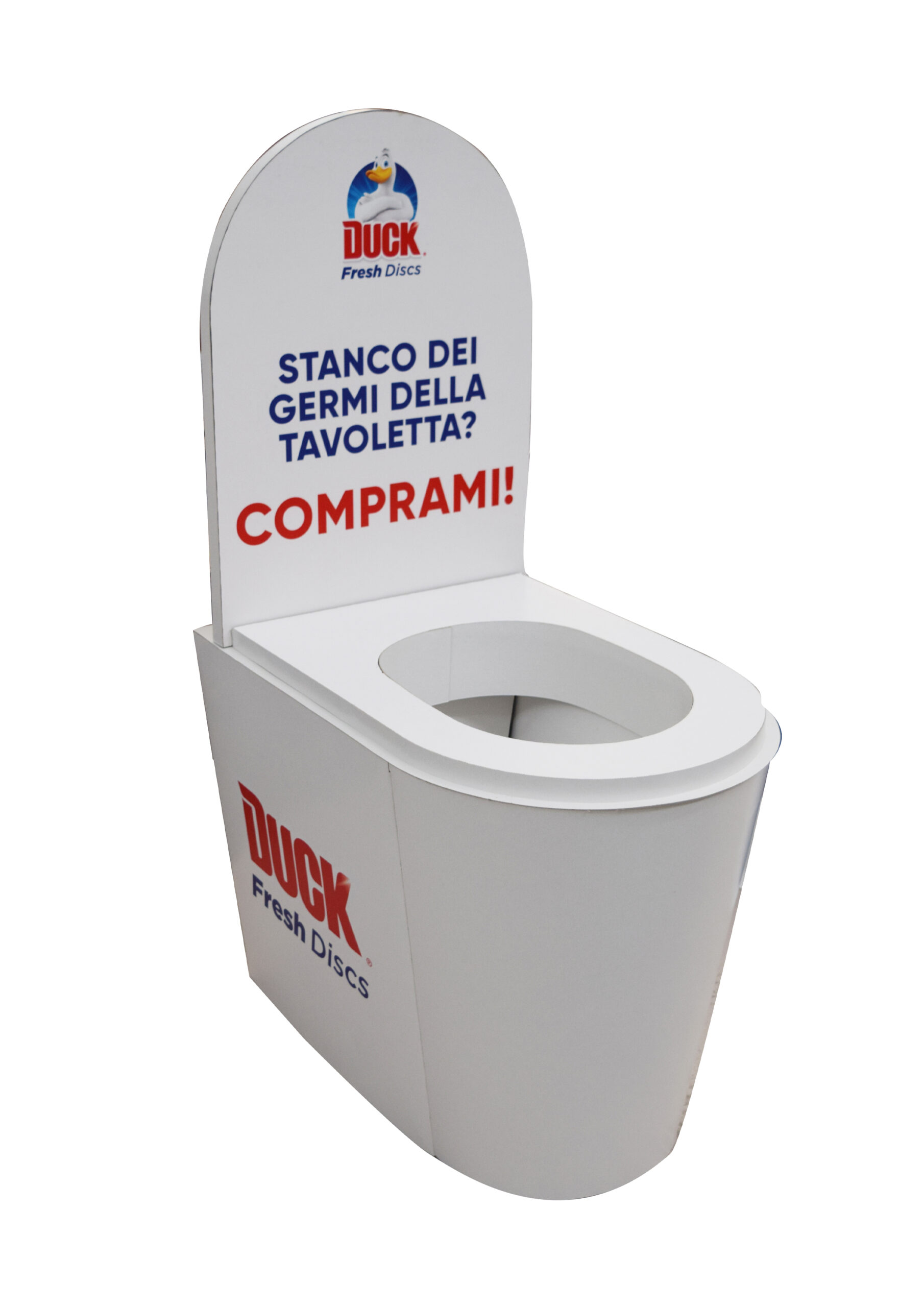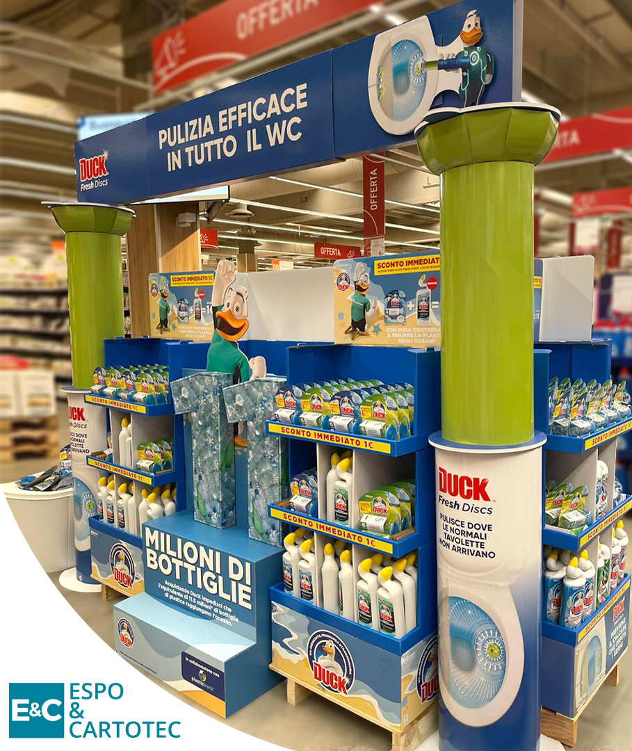 I materiali POP comunicavano i benefici principali, caratteristici di entrambi i prodotti ed il loro lato “sostenibile”. Grazie infatti all’acquisto di Duck Liquido WC Gel Biodegradabile (il cui flacone è composto per il 50% da plastica recuperata in prossimità di oceani/corsi d’acqua, in collaborazione con Plastic Bank) impedisci che l’equivalente di 11.5* milioni di bottiglie di plastica raggiungano l’oceano.