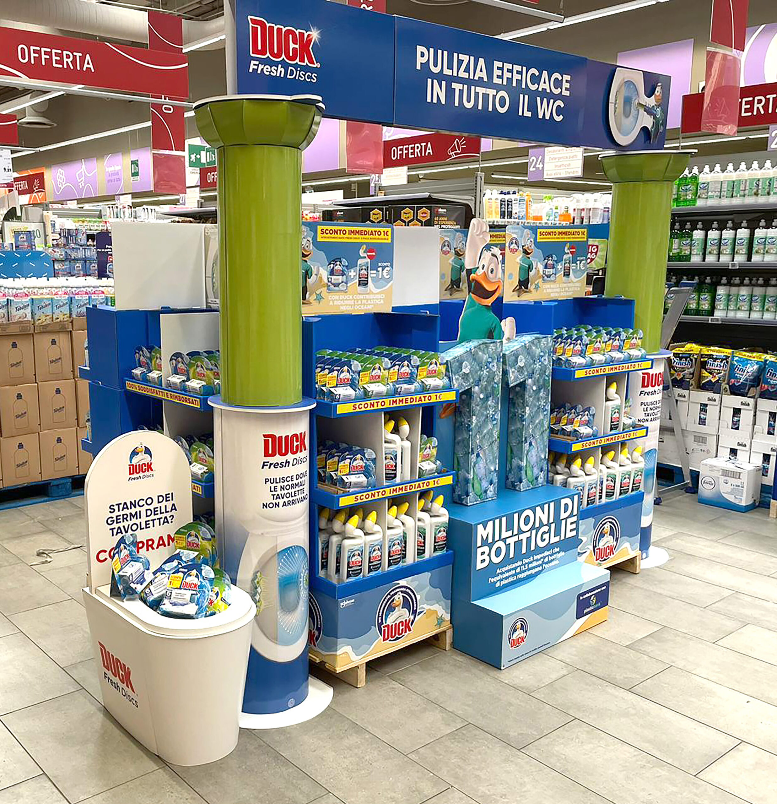 L’attività, effettuata nei punti vendita Iper di Spazio Conad, prevedeva la creazione di aree promo dedicate ai prodotti Duck Fresh Discs e Duck Liquido WC Gel Disinfettante durante il mese di Giugno 2023, periodo di alta stagionalità per i prodotti Cura WC.