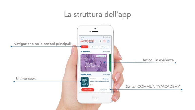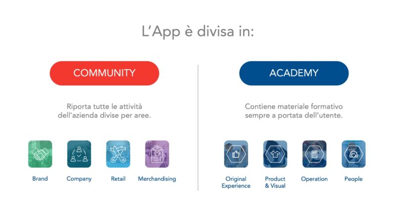 L’app si presenta divisa in due sezioni : Community, riporta tutte le attività dell’azienda ed Academy contenente tutto il materiale formativo.