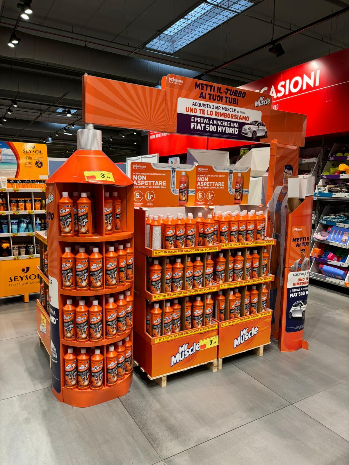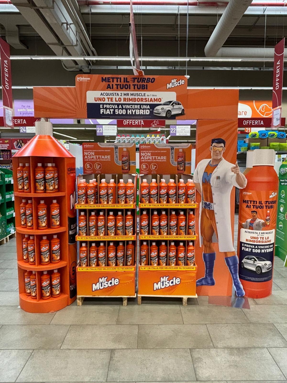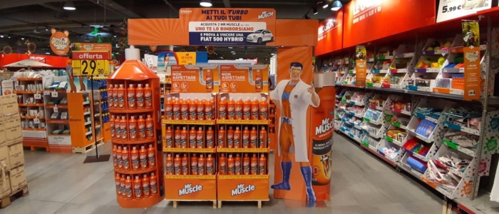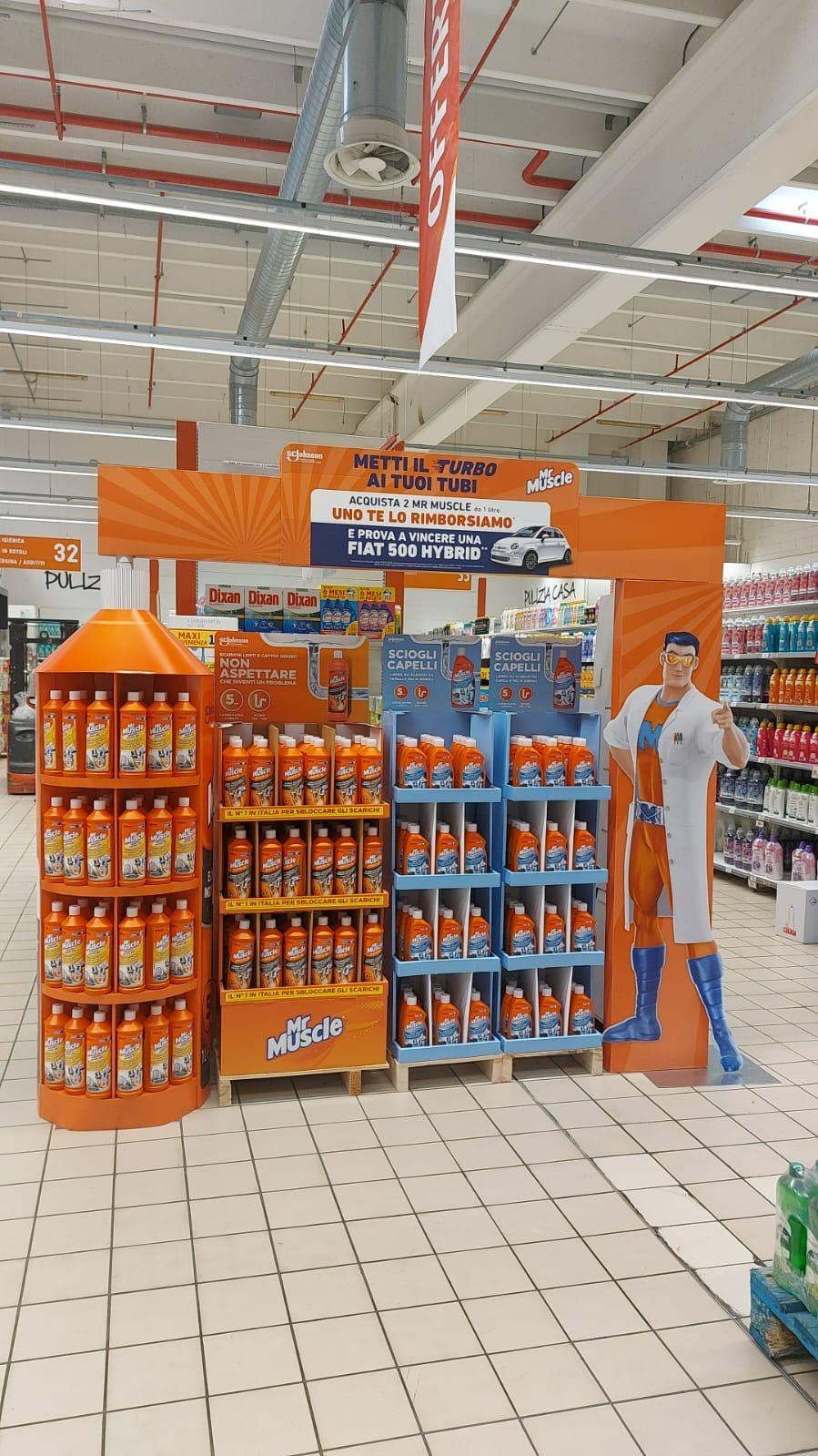 Il cliente ha voluto attivare uno special event sui punti vendita per il brand Mr Muscle. L’obiettivo era quello di prendere spazio sul punto vendita comunicando la promo con il relativo concorso e facendo il tutto cercando di ottenere un effetto WOW sullo shopper. Per questo si è pensato di sfruttare l’iconicità del prodotto Mr Muscle che si prestava bene nella sua versione jumbo pack per realizzare un portale.