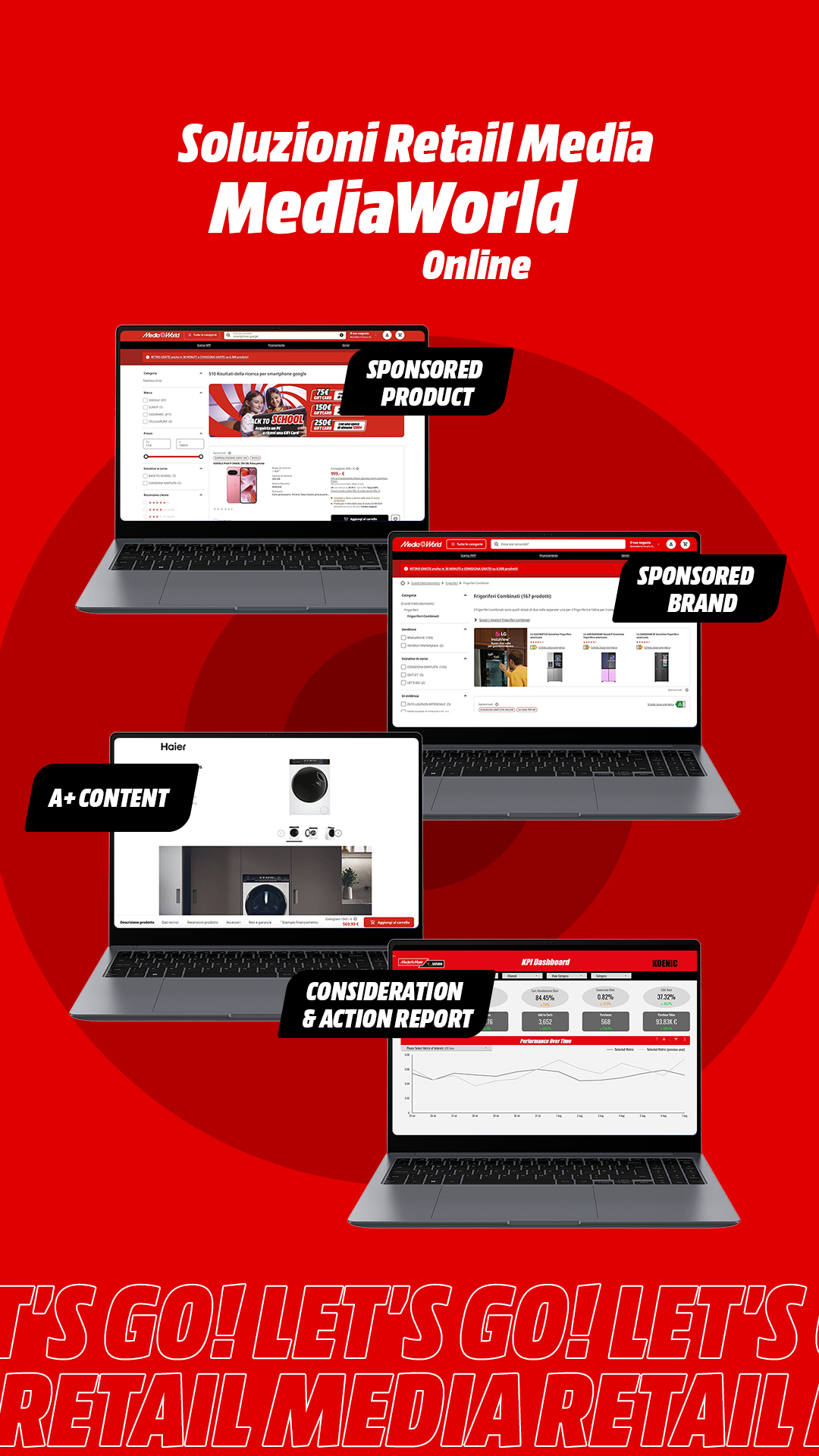 Le soluzioni Retail Media Digital studiate da MediaWorld offrono la possibilità di mettere in evidenza specifici prodotti, aumentare la brand awareness e visualizzare i dati delle campagne. Gli strumenti introdotti sono: SPA (Sponsored Product Adv), SBA (Sponsored Brand Adv), A+ Content e Consideration & Action Report.