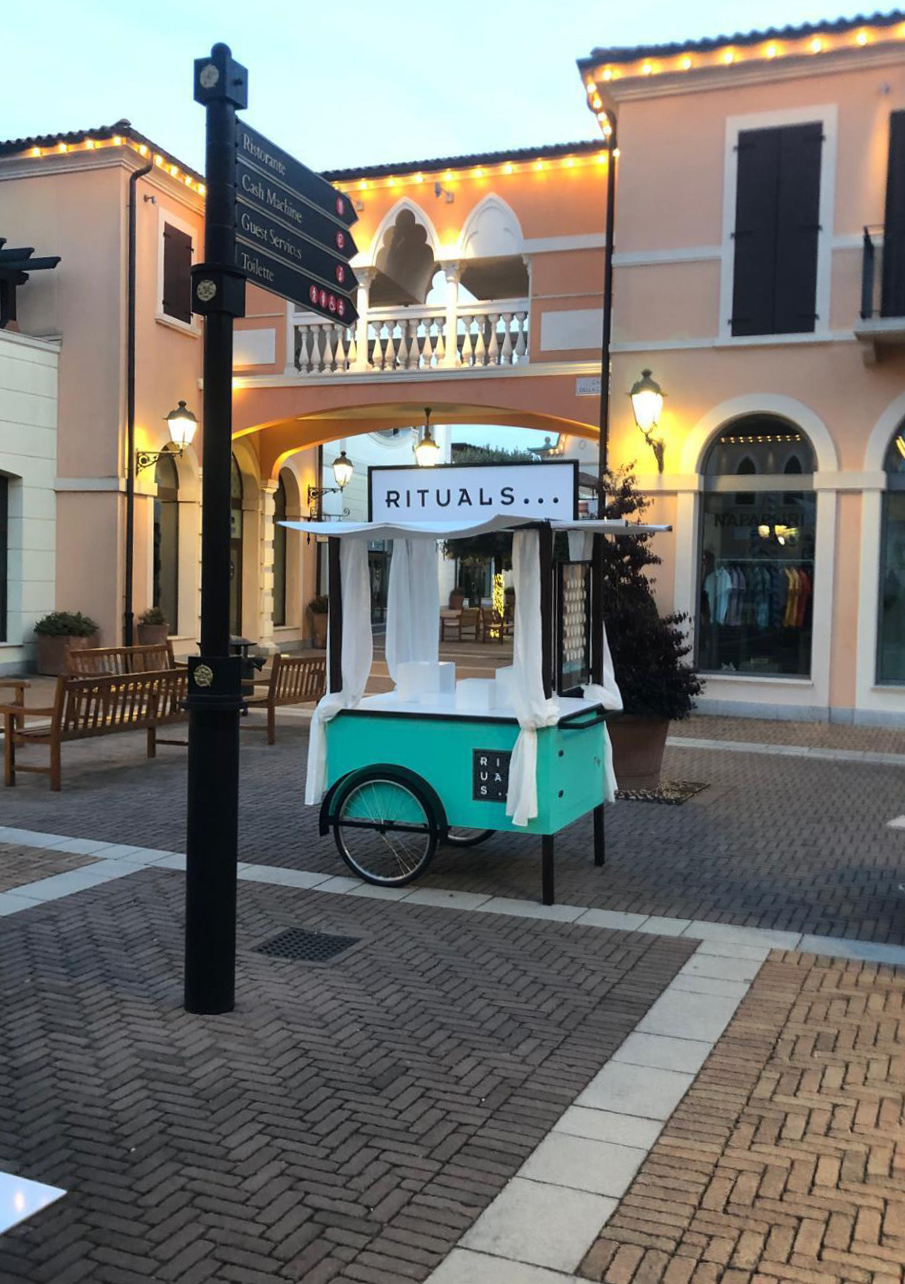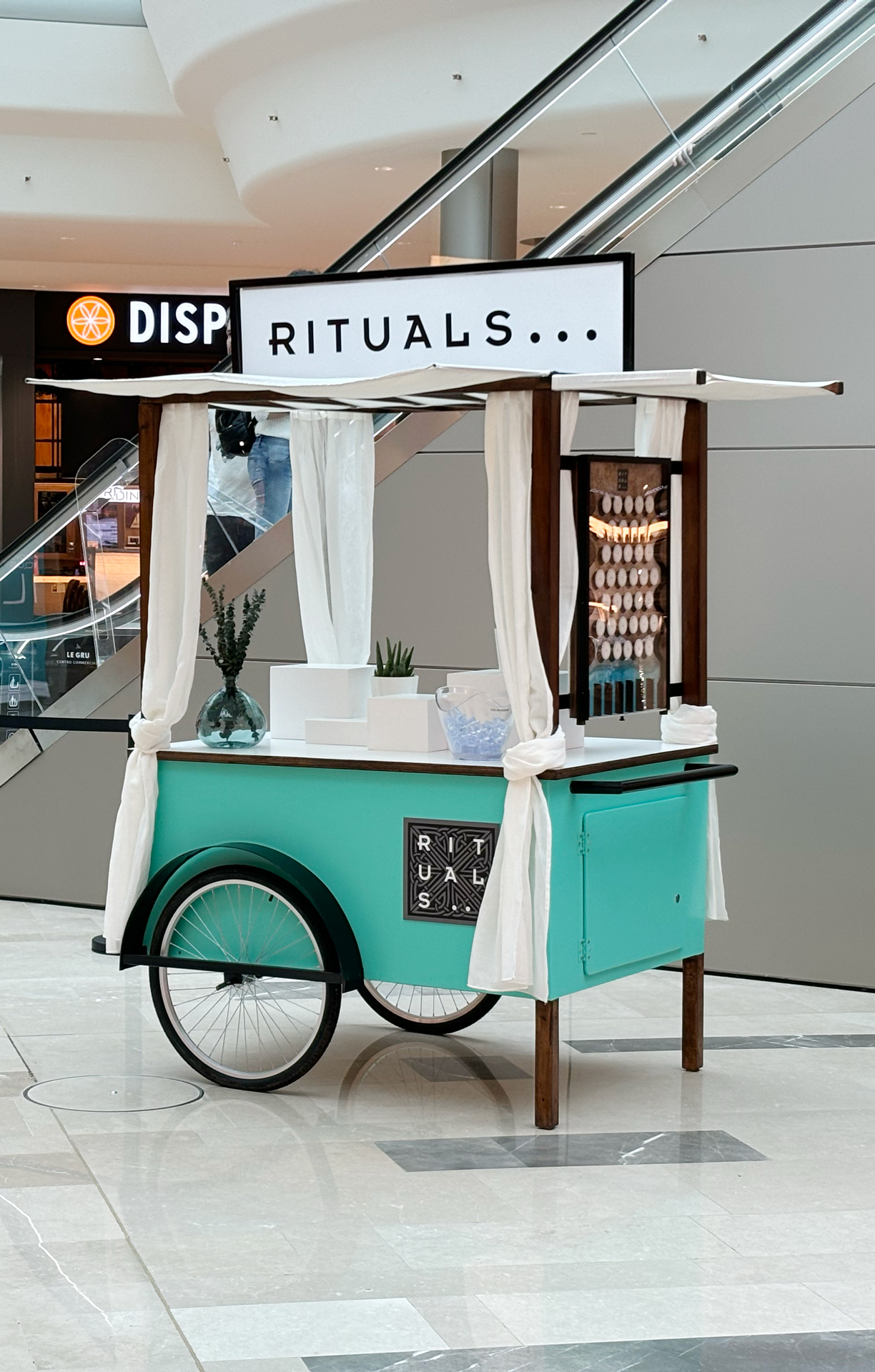 Realizzato artigianalmente, il RITUALS KARMA CART presenta un ampio spazio dedicato all’esposizione dei prodotti e piante di aloe ed eucalipto, ingredienti principali della gamma solari Karma. La sua struttura è stata pensata per poter essere “vestita” ed utilizzata in diverse occasioni di promozione.