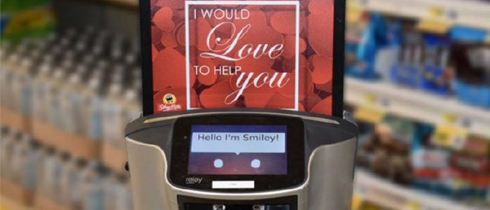 Il produttore di dolciumi americano Mars Wrigley ha sviluppato un robot autonomo che si aggira per i supermercati di vendita di chicche ai clienti. Il robot si chiama “Smiley” e mira a sostituire gli acquisti impulsivi effettuati presso la cassa, che non sono più presenti nei negozi automatizzati o alle casse automatiche. “Smiley” produce una gamma di suoni ed esegue brevi balletti per attirare l’attenzione su se stesso, pur essendo in grado di muoversi intorno agli ostacoli e clienti. I clienti possono interagire con il robot tramite il touchscreen e possono richiedere prodotti specifici, come una certa marca di gomma da masticare.