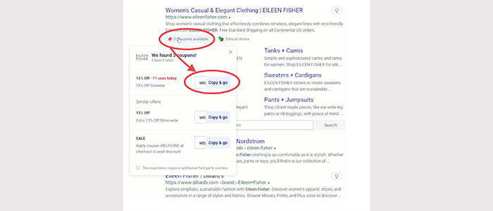 Il motore di ricerca Bing sta integrando i suoi risultati con suggerimenti su come gli utenti possono risparmiare tempo e denaro, e allo stesso tempo fare acquisti con maggiore consapevolezza su temi come la tutela dell’ambiente. Durante la ricerca di un negozio online specifico, Bing mostra nei risultati se sono disponibili sconti o coupon. Per vederli non è necessario installare un plug-in o visitare il sito web del negozio. I coupon possono essere richiesti con un solo clic e riscattati automaticamente quando si effettua un acquisto direttamente sul sito del negozio. Il suggerimento “Scelta etica” invece, aiuta gli utenti a trovare abbigliamento ecologico, riciclato o del commercio equo e solidale, che sono valutati dall’app “Buono per te”.