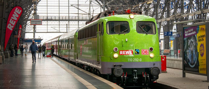 Nell’ambito del progetto “Fair supermarket train”, REWE, DB Regio e Fairtrade vogliono mostrare come è possibile rendere la vita quotidiana più sostenibile quando si viaggia o si fa la spesa. Il treno del supermercato partirà per un periodo di tempo limitato a Francoforte e poi attraverserà sei città dello stato tedesco. Il treno speciale è composto da sei vagoni spesa che vendono prodotti equosolidali, biologici e regionali, oltre ad avere un bistrot a bordo. Gli orari di apertura del treno del supermercato sono dalle 9:00 alle 19:00 e non è necessario acquistare i biglietti per fare la spesa.