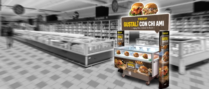 Con “Gustali con chi ami” Tulip porta una ventata di colore nei punti vendita. Il pacchetto include una vasca refrigerata dove esporre i prodotti mostrandone i colori accessi, contornata da stickers raffiguranti hamburger e panino pulled pork; a ciò si aggiunge un crowner fustellato ad altezza occhi completato da due display ovali utili a coprire i lati della vasca ma anche ad aumentare in modo netto la visibilità. L’obiettivo è quello di attrarre il consumatore tramite il colore ed il crowner visibile in lontananza, incrementando i trial di questi prodotti e generando valore per una categoria spesso parca di innovazione.