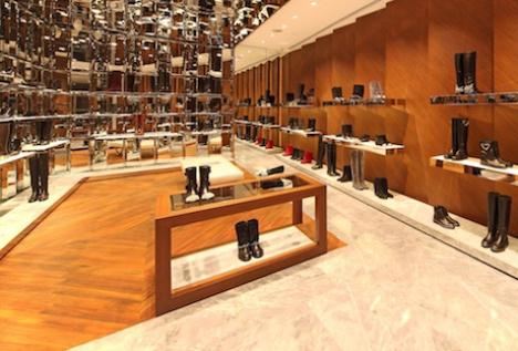 La boutique presso il mall Plaza 66 ha una superficie di 62 metri quadri ed è concepita come una stanza-guardaroba ideale, dove si celebra quel rito speciale che è la scelta di una calzatura da parte di una donna. Pareti e soffitto specchiati, scaffalature in pelle bianca, pavimento in marmo Bardiglio e un day-bed al centro della scena concorrono a creare la giusta atmosfera.