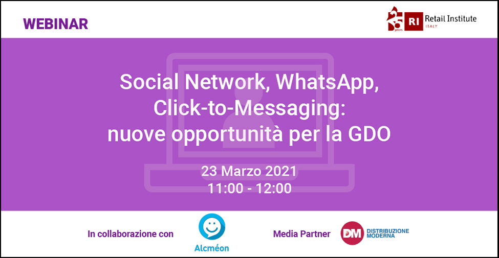 Ne abbiamo parlato il 23 marzo 2021 in occasione del webinar organizzato in collaborazione con Alcméon “Social Network, WhatsApp, Click-to-Messaging: nuove opportunità per la GDO” che si è tenuto dalle ore 11:00 alle ore 12:00.