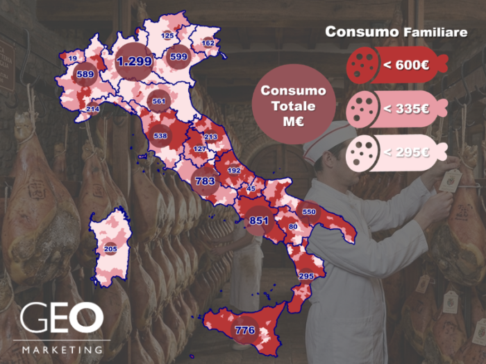 La mappa mostra i consumi delle famiglie per la categoria salumi, intesa come preparazione di carne essiccata, salata, in salamoia o affumicata.