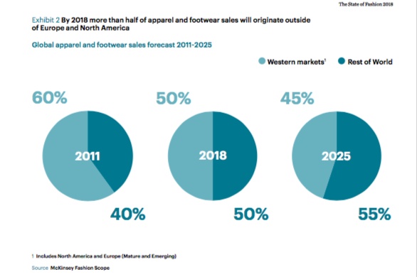 La conferma arriva anche dall’ultimo rapporto elaborato da McKinsey & Company assieme a The Business of Fashion (BoF). Il 2018 passerà infatti alla storia per essere l’anno in cui il 50% del giro d’affari di abbigliamento e calzature (un settore da 2.500 miliardi di dollari, 2.108 miliardi di euro) sarà prodotto fuori dall’Europa e dal Nord America, con l’Asia Pacific, ma anche l’America latina e l’Africa patria di Millennials come regioni trainanti dei consumi.