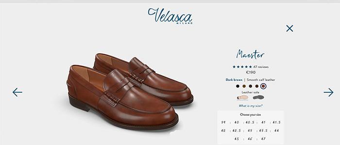 La digital customer experience di Velasca permette all’utente di visualizzare la scarpa nei minimi particolari, valutarne il materiale, scegliere il colore. A supporto dei benefici del 3D Commerce vi è una ricerca di Retail Institute e UniBo, in collaborazione con Invrsion ed Euronics.