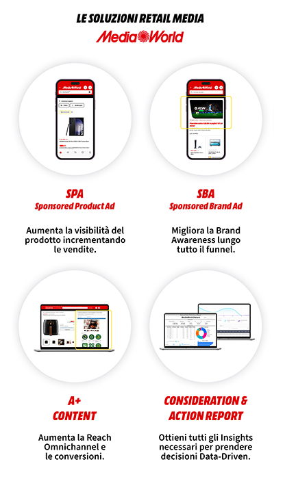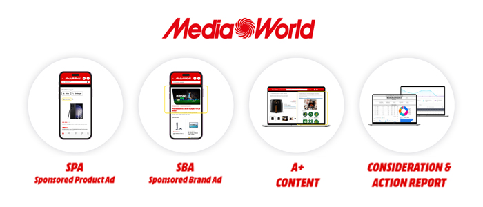 Le soluzioni Digital dedicate studiate da MediaWorld offrono la possibilità di mettere in evidenza specifici prodotti, aumentare la brand awareness coinvolgendo un target ad alto potenziale e visualizzare in real time i dati della campagna. Gli strumenti introdotti sono: SPA (Sponsored Product Advertising), SBA (Sponsored Brand Advertising), A+ Content e Consideration & Action Report.
