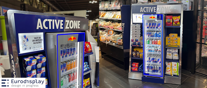 L’Active Zone Red Bull è uno strumento permanent multicategoria per l’esposizione Food nella parte ambient & Beverage nella sezione refrigerata nel canale prossimità e travel/on-the-go. Ottimizza lo spazio e aumenta il valore del singolo metro espositivo enfatizzando la shopping mission del canale con un corner ad hoc. Struttura di design moderno ed accattivante dà visibilità esprimendo il need funzionale con gli elementi iconici di Red Bull. Le due zone espositive, premium e innovative, creano opportunità ad alto valore di servizio ampliando la purchasing opportunity. Strumento permanent e sostenibile in legno, metallo, metacrilato, led e supporti retroilluminati, crea una zona facile da gestire sia nella sezione frigo che per l’assortimento grazie ai ripiani modulari in altezza. Progetto multicanale, testa la nuova applicazione digitale di gestione e controllo logistico. Il Team Eurodisplay (che è anche produttore e allestitore) ed i responsabili del progetto di Red Bull Italia, hanno creato un sistema online che permette di seguire, condividere ed archiviare in tempo reale, in database centralizzato, le informazioni relative al singolo allestimento.