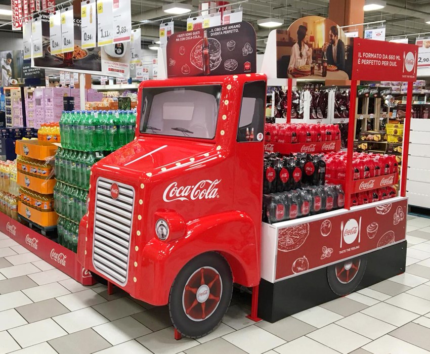 Coca-Cola HBC Italia aveva come obiettivo la realizzazione di una struttura istituzionale, durevole, di forte impatto visivo e di coinvolgimento in store sulla scia dei vecchi veicoli utilizzati per la distribuzione del prodotto. L’ispirazione per il design del truck old style è derivata in particolare dalle linee bombate dei modelli Coca-Cola anni 50’ che abbiamo sviluppato fin dove possibile tenendo in debito conto le possibilità realizzative dettate dalle tecniche di produzione. In questa ottica, abbiamo sviluppato un progetto che, seppure finalizzato alla creazione di una struttura WOW, ne rende possibile la produzione anche in numeriche molto alte mantenendo un costo sostenibile per il cliente.