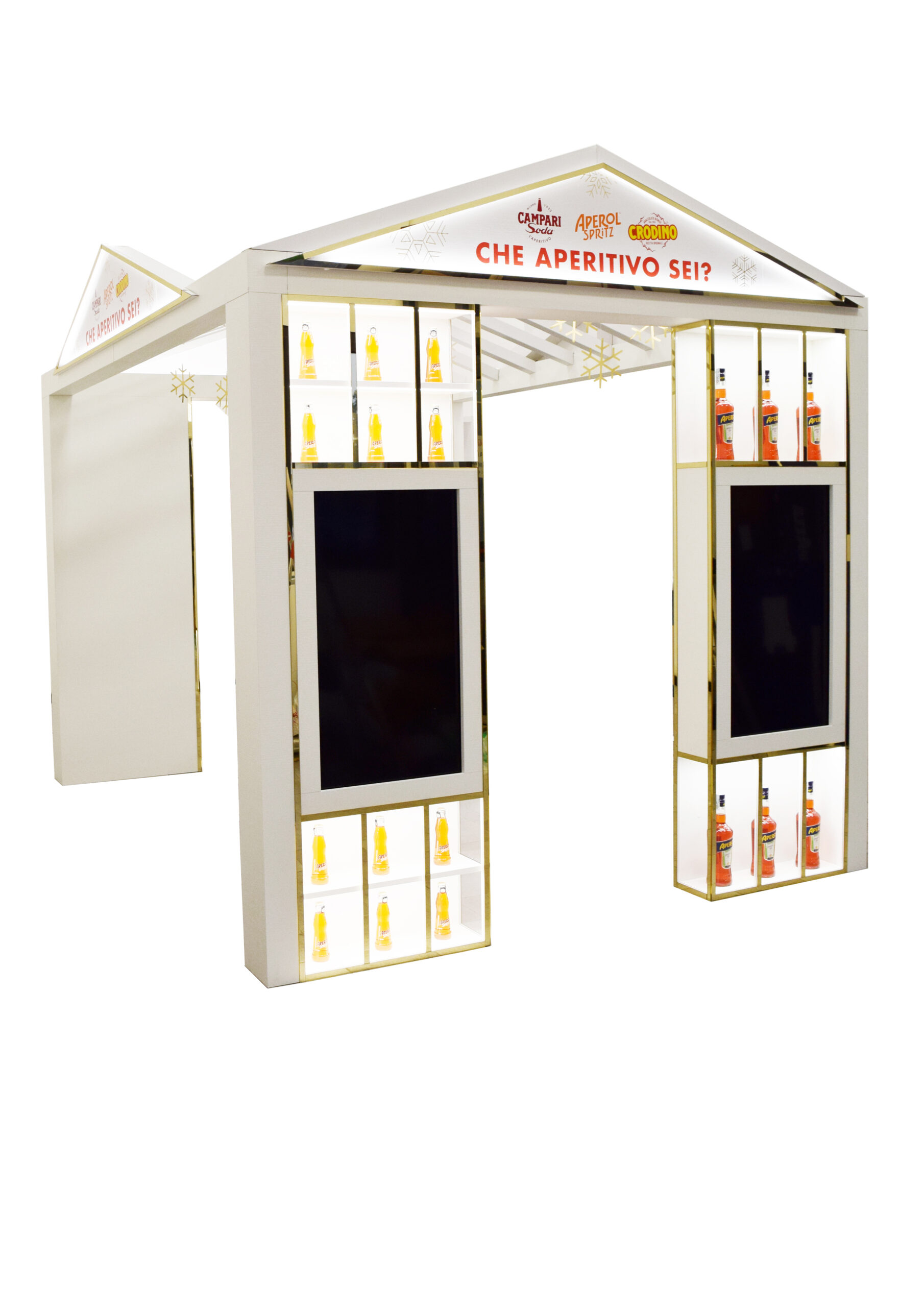 La struttura permette allo shopper di accedere ai prodotti sia esternamente che passando all’interno della casa, l’interno del tetto è stato impreziosito da fiocchi di neve in laminl dorato.