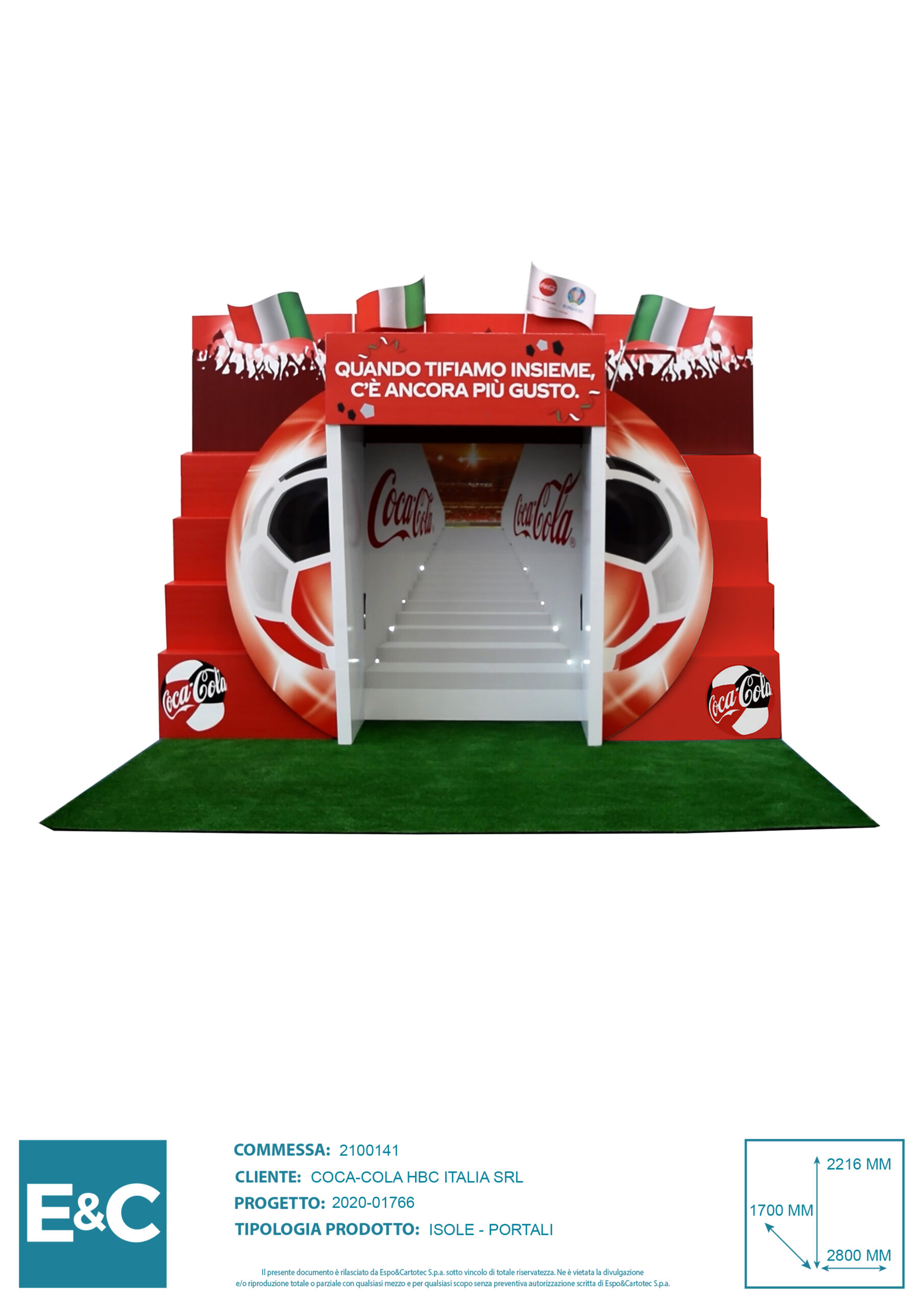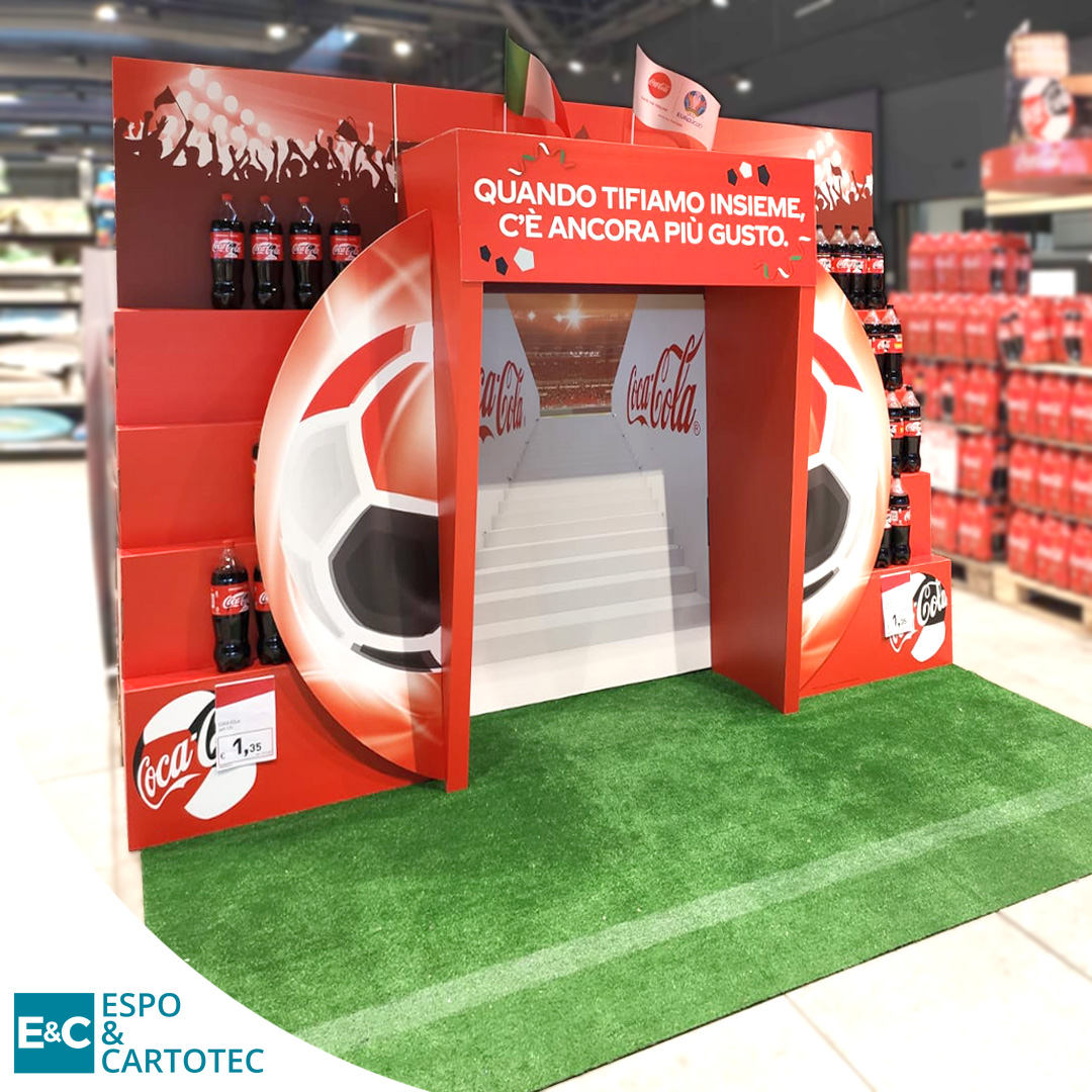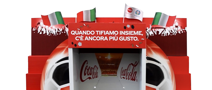 Abbiamo progettato uno spazio esperienziale multimateriale (cartone, forex, led) che rappresenta le tribune dello stadio, dove sugli spalti sono esposte le bottiglie di Coca Cola per favorire l’acquisto di impulso.