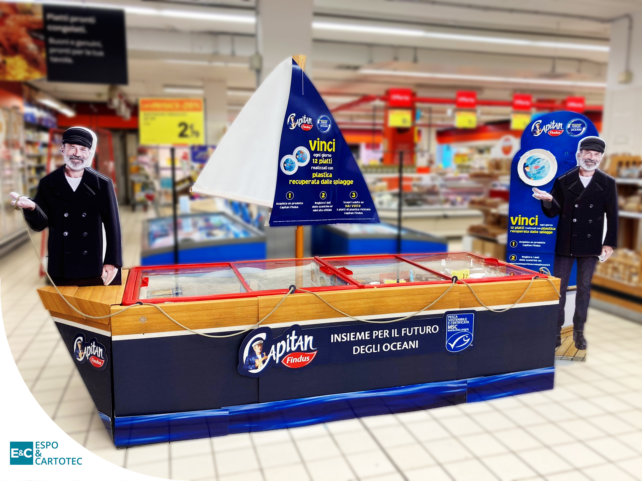 Catturare l’attenzione del consumatore, anche quello più distratto era l’obiettivo del cliente e noi lo abbiamo realizzato attraverso materiali impattanti, personaggi tridimensionali e attivatori sonori che trasportavano chiunque passasse davanti alla struttura nel mondo di Capitan Findus, su un veliero, in mare aperto, con gabbiani e vento (riprodotti sia a livello acustico sia fisico attraverso il movimento della vela).