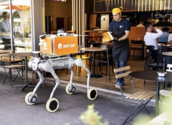Just Eat Takeaway ha collaborato con l’azienda svizzera RIVR per testare cani robot autonomi per la consegna di cibo a Zurigo. I robot sono progettati per distanze più lunghe, combinano ruote per il movimento con zampe (gambe) per salire scale e marciapiedi e possono raggiungere circa 15 chilometri orari.