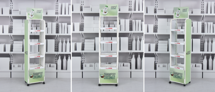 Il Domino Display è inoltre dotato di ruote, per una facile movimentazione nel punto vendita. Viene consegnato steso, in un imballo dalle dimensioni contenute, per avere massima efficienza anche per trasporto e logistica.