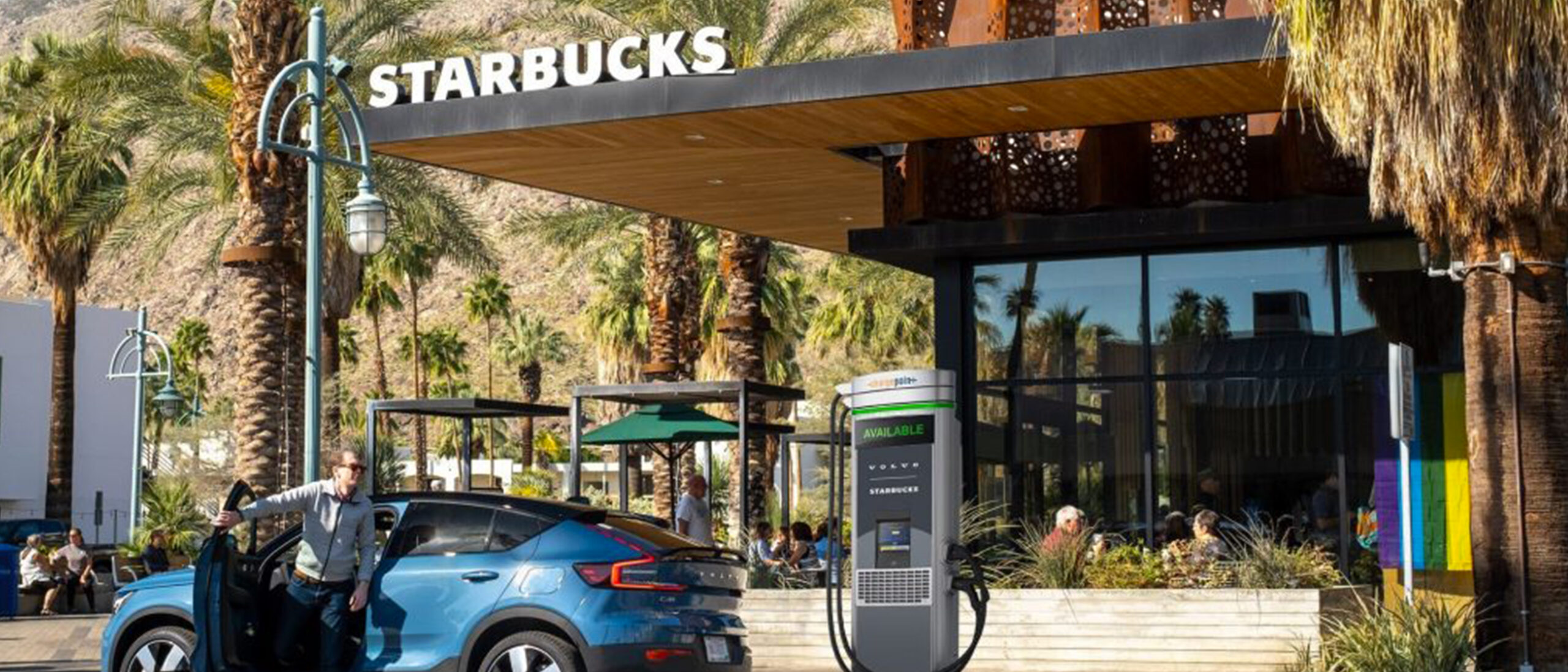 La catena di caffè Starbucks ha collaborato con Volvo per creare una rete di ricarica per veicoli elettrici che copre i 2.200 chilometri tra Seattle e Denver. Entro la fine del 2022, il piano è di installare circa 60 caricabatterie rapidi CC in 15 negozi Starbucks lungo il percorso, ovvero circa uno ogni 100 miglia.
