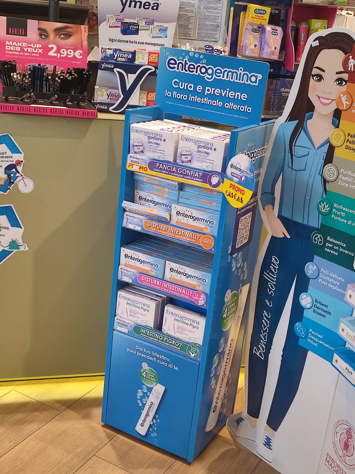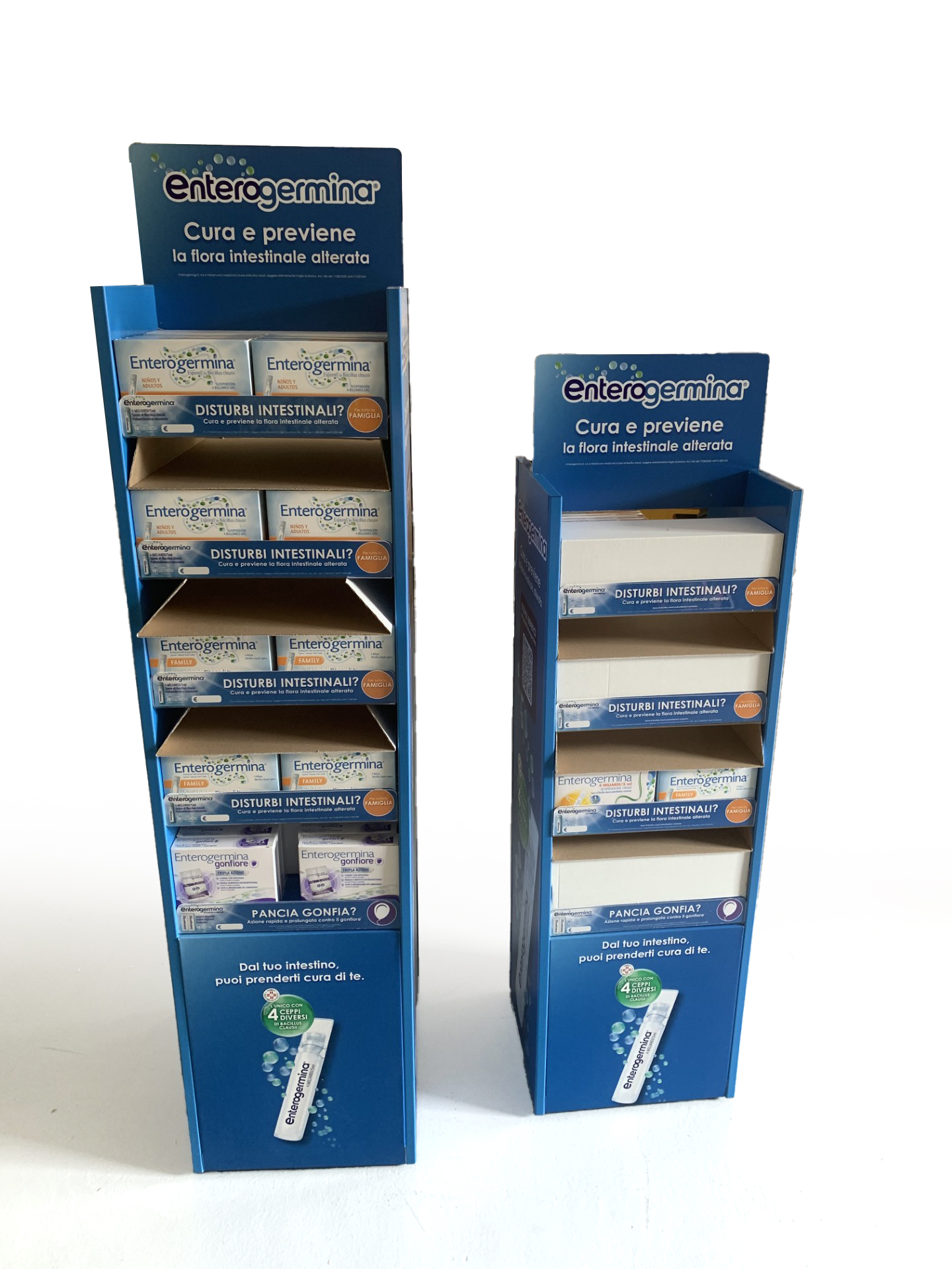 Sostenibilità e riduzione impatto ambientale sono alla base della nuova flotta di espositori durevoli Enterogermina, progettate in due versioni: piccolo (4 scaffali) e grande (5 scaffali).