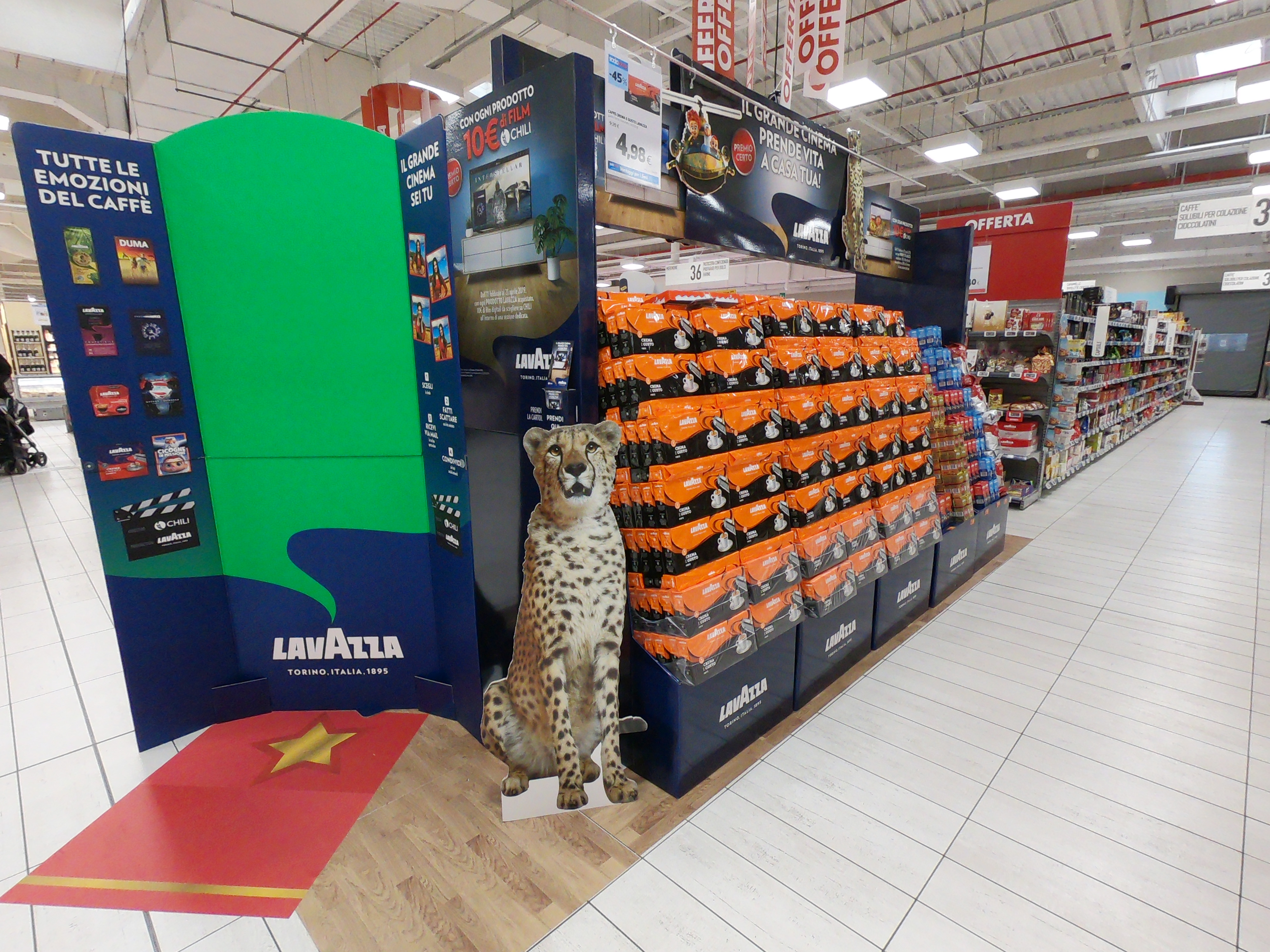 Per rendere spettacolare l’engagement e coinvolgere lo shopper è stato ideato un teatrino, composto nella parte centrale da un pannello green screen, ed una comunicazione sui pannelli laterali che descriveva l’animazione; un tappeto rosso ha contributo a creare l’atmosfera cinema, mentre le sagome della navicella spaziale e del ghepardo, posizionate vicino al teatrino e tratte da film Warner, hanno attirato l’attenzione degli shopper sul punto vendita.