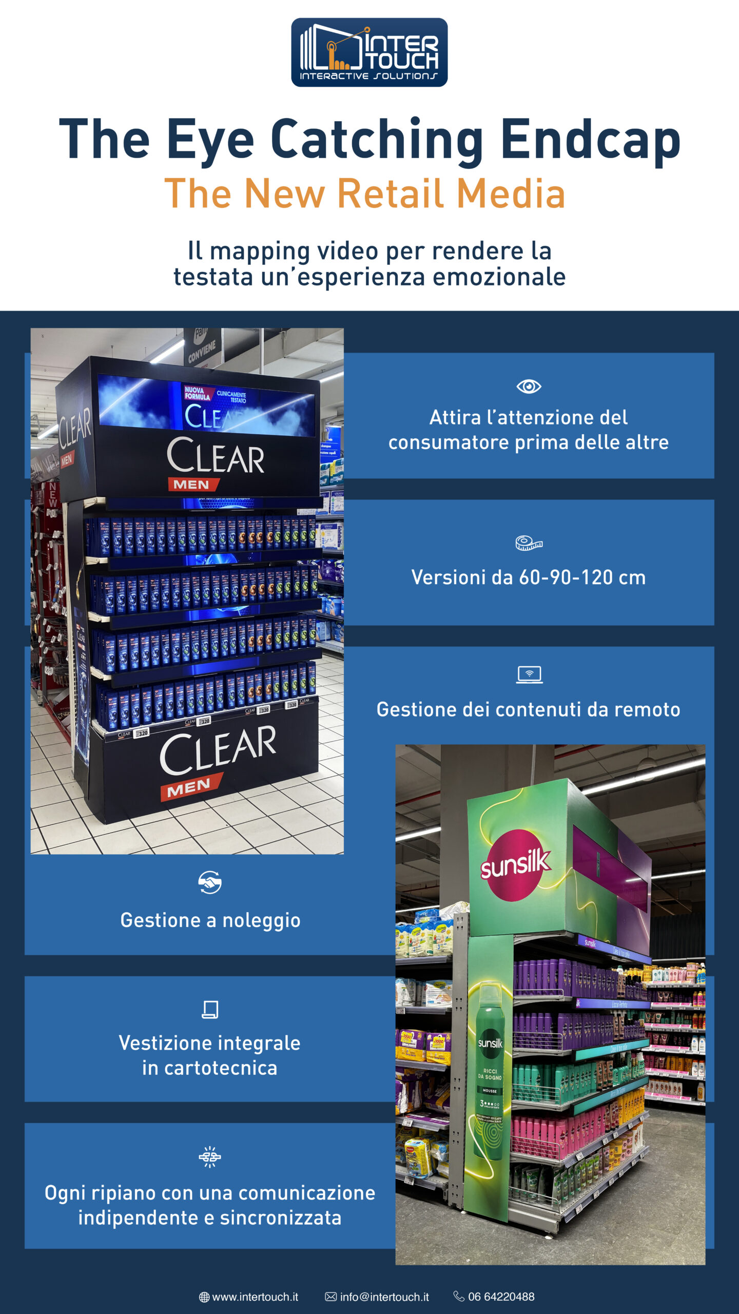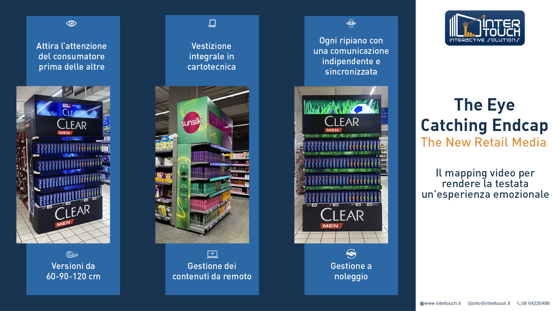L’Eye Catching Endcap, soluzione ideata da Intertouch, integra schermi di ultima generazione ad alta risoluzione, tecnologie IoT e una piattaforma di marketing signage che dialoga con il consumatore nel momento della decisione di acquisto.