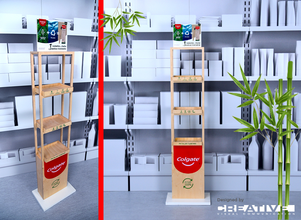 La finalità del progetto è comunicare i valori della nuova gamma di prodotti eco Colgate anche tramite un display realizzato con materiali ecologici.