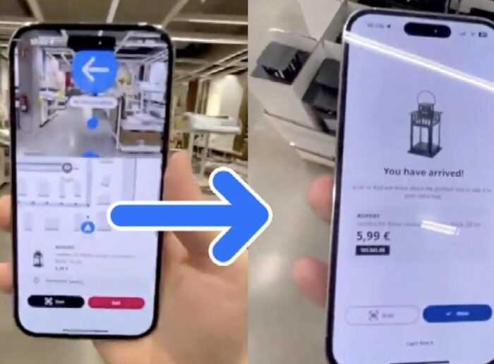 IKEA sta testando la navigazione in realtà aumentata in alcuni punti vendita selezionati, permettendo così ai clienti di essere guidati all’interno del negozio in tempo reale tramite il proprio smartphone. Tenendo il dispositivo in posizione orizzontale, compare una mappa vista dall’alto per offrire un orientamento chiaro all’interno del negozio. Sollevando lo smartphone, si attiva la modalità AR, che proietta le indicazioni direttamente sull’ambiente circostante, guidando i clienti tra i corridoi. Questa funzione in realtà aumentata si basa su un sistema sviluppato dall’azienda Hyper e non richiede hardware aggiuntivo, ma utilizza l’infrastruttura Wi-Fi già esistente.