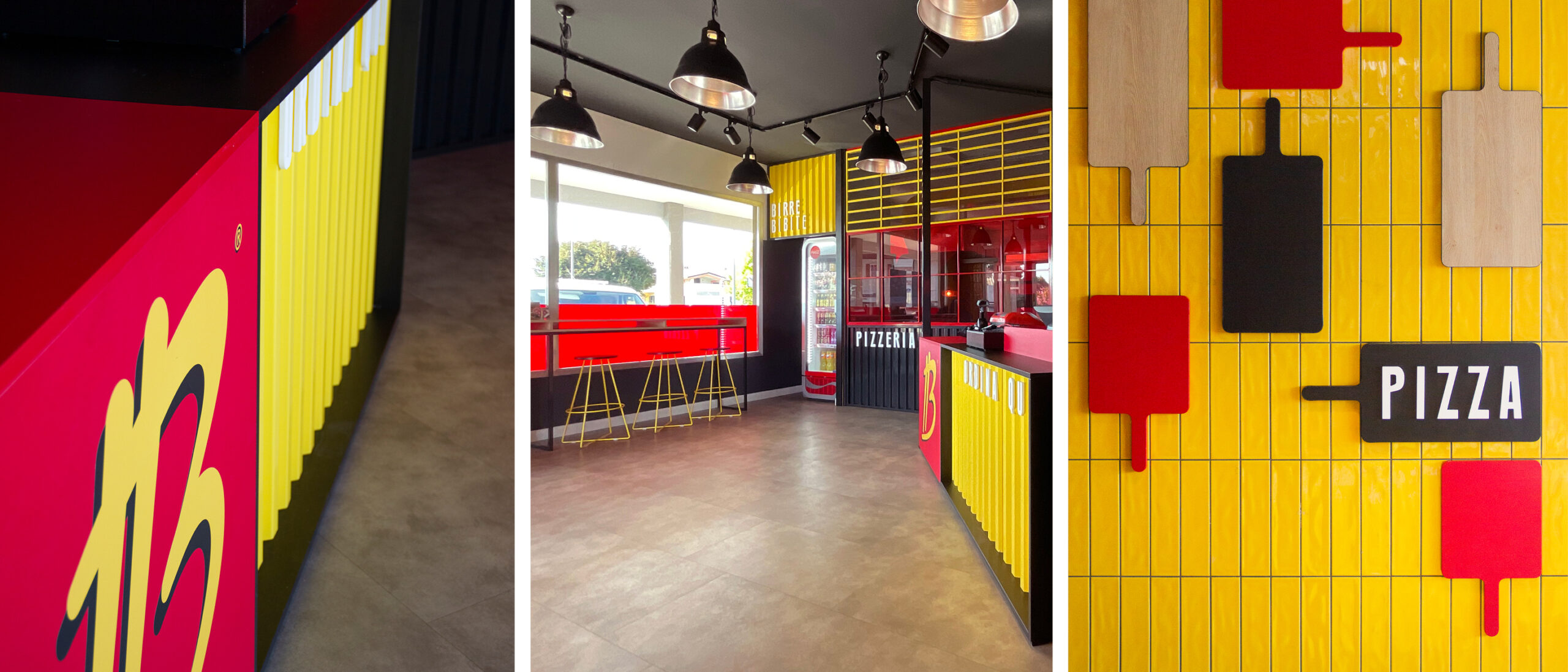 Cura dei dettagli, cromie accese, valorizzazione dei supporti di comunicazione e attenzione alla gestione funzionale dello spazio rendono l’ambiente coerente con un’offerta che vuole distinguersi e prendere le distanze dal modello fast food che caratterizza il territorio.