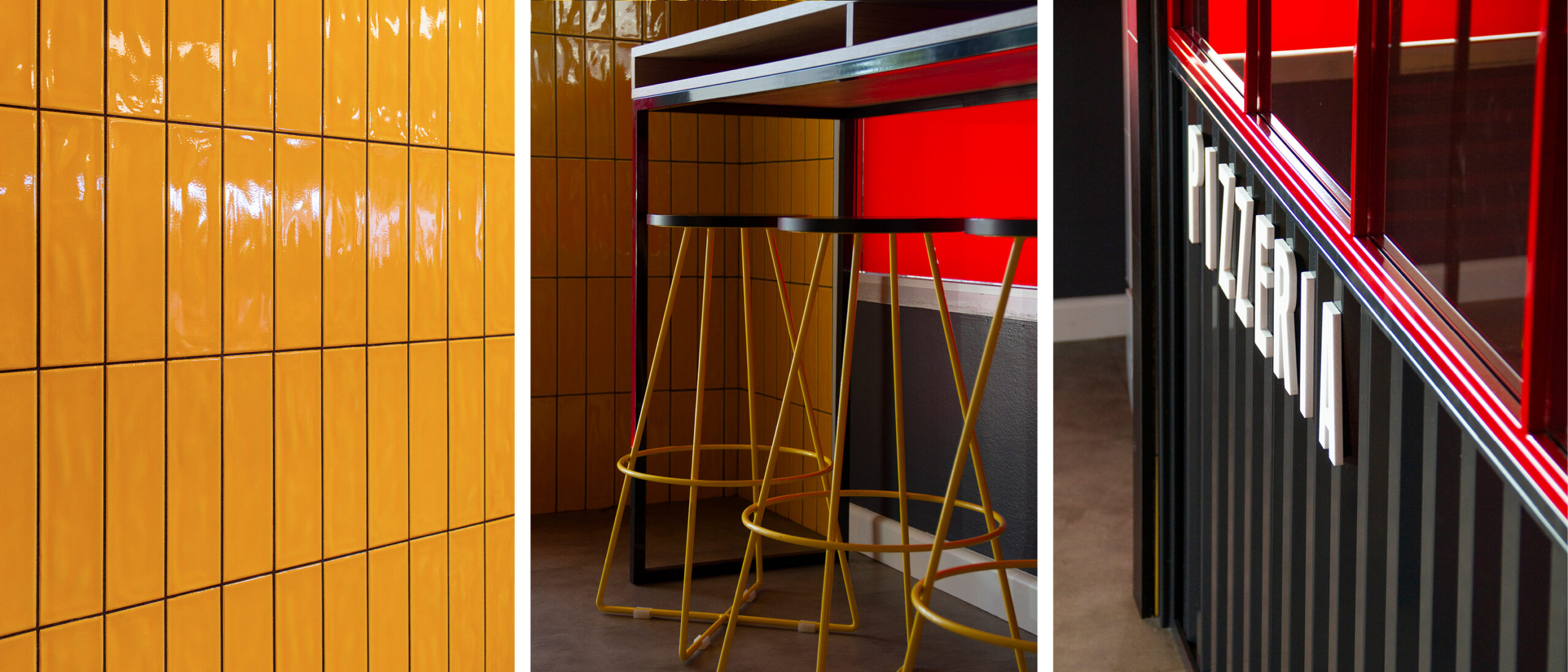 Giovane, caldo e accogliente ma con uno spirito metropolitano. Un ambiente caratterizzato da materiali che trasmettono la genuinità dei cibi, così come le vetrate sulle lavorazioni a vista. I contrasti cromatici della brand identity trovano spazio nell’area di accoglienza e continuano nelle zone operative.
