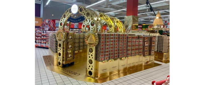 Isola realizzata interamente in cartone laminato oro che replica le luminarie tipiche del basso Salento. Progetto studiato insieme al cliente per riuscire a replicare quanto più possibile l’impatto visivo fortemente iconico delle luminarie. All’interno della struttura cartotecnica sono state applicate delle luci led che attirano ancora di più l’attenzione per un effetto wow. Si tratta di una struttura flessibile con più moduli indipendenti tra di loro, formati da archi autoportanti, che permettono l’adattabilità sul punto vendita. Grazie al nostro know-how in materia cartotecnica e alla fiducia riposta in noi dal cliente siamo riusciti a concretizzare un progetto molto ambizioso con ottimi risultati in termini di presenza sul punto vendita e comunicazione.