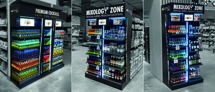 La suddivisone della struttura in due zone, Organics e alcolici, distinte ma dialoganti, ha generato un layout che con la semplicità ha risolto la complessità iniziale dando massima visibilità al prodotto, sfruttando la cromaticità delle referenze e le trasparenze del contenitore in vetro. È una struttura premium, dal design semplice ed elegante che consente l’immediata associazione tra distillato e referenza Organics per il proprio MIX. I materiali richiamano in modo immediato gli arredi del mondo Horeca. Legno, metallo, metacrilato, led e supporti stampati retroilluminati sono stati la scelta immediata e vincente. Ogni singolo allestimento è stato personalizzato in funzione delle esigenze del punto vendita, superando limiti di spazio disponibili e di collocazione categoria.
