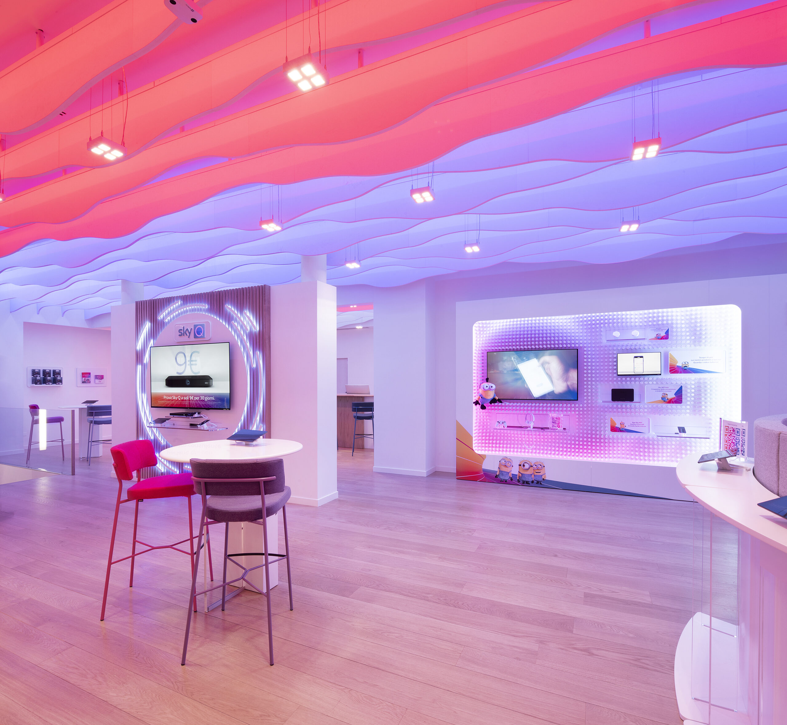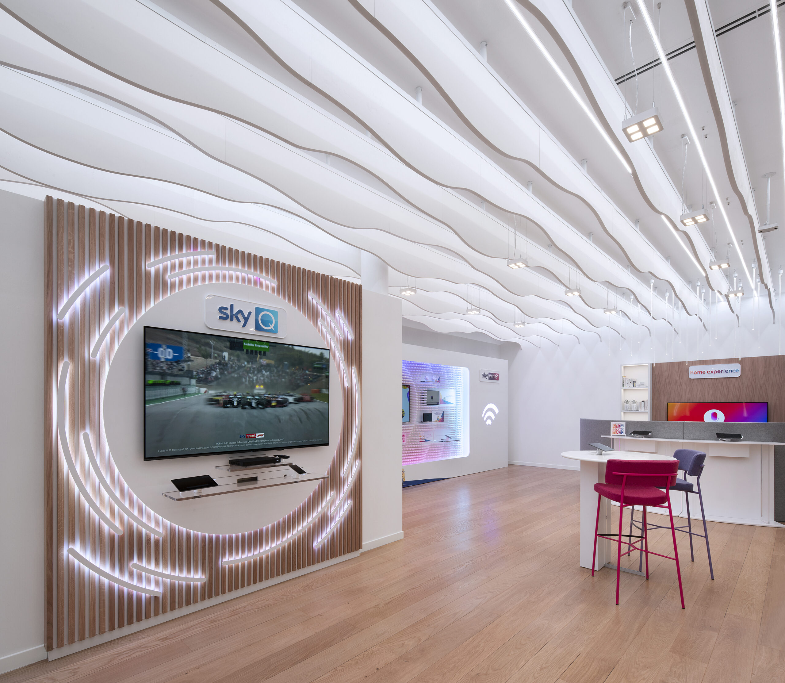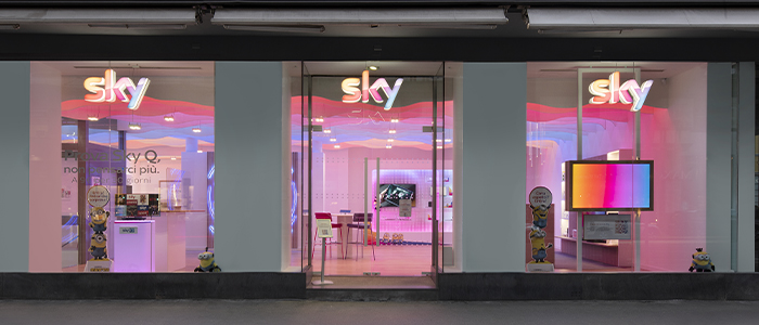 Creare un luogo sorprendente ed immersivo, dove poter provare tutti i servizi e le novità del mondo Sky attraverso un’esperienza straordinaria e spettacolare: questa la sfida del progetto che Sky Italia ha sviluppato con la collaborazione de Il Prisma, società internazionale di architettura e design, per la realizzazione della nuova rete di negozi monomarca.