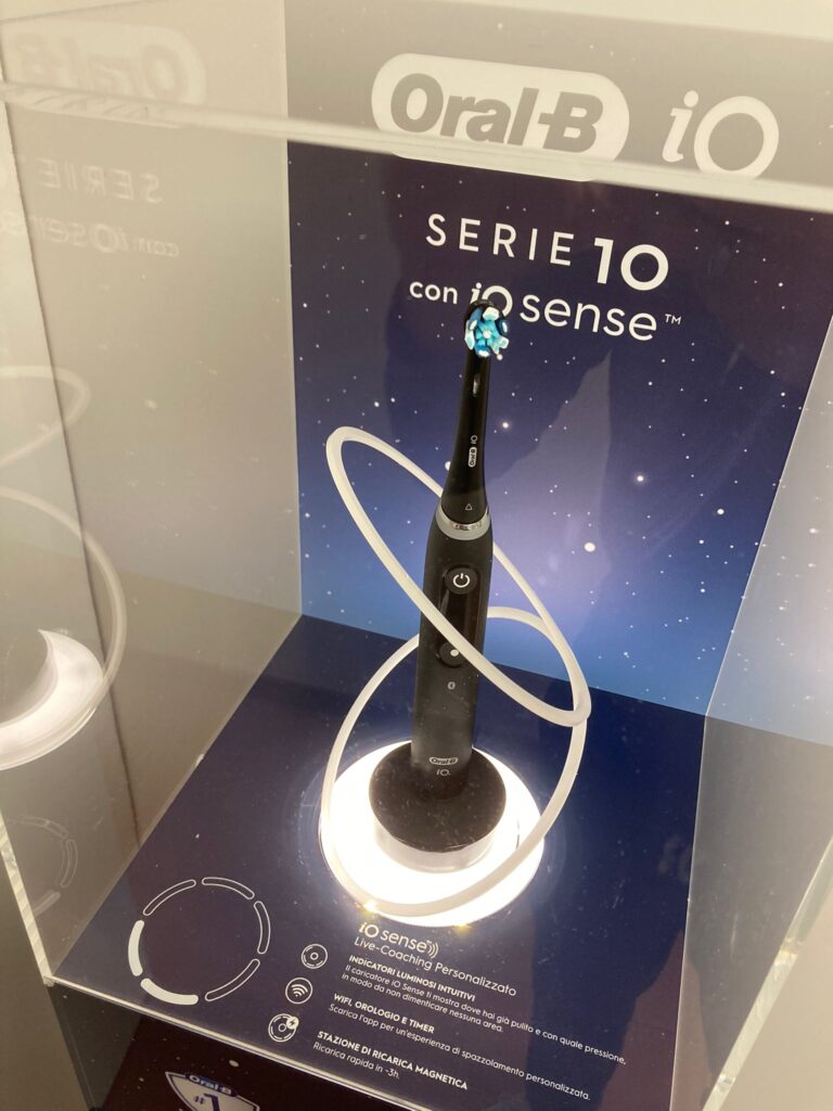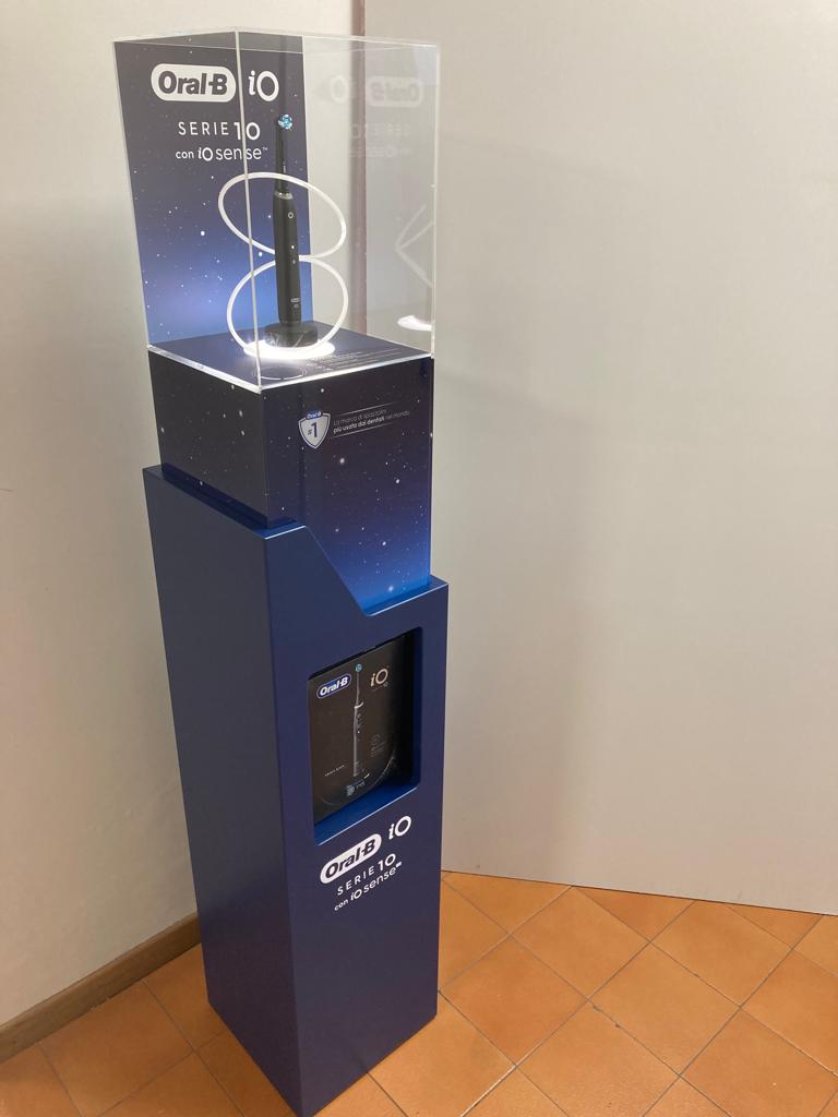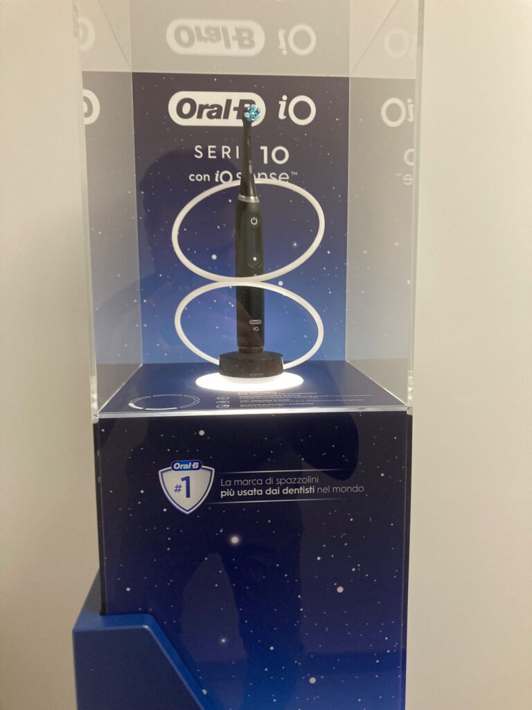 In occasione del lancio del nuovo spazzolino Oral-b Io Serie 10, P&G insieme a Gruppo Fma (agenzia creativa) e Communisis (agenzia esecutiva) hanno studiato un materiale durevole per punto vendita, iconico ed attrattivo, in grado di glorificare il nuovo prodotto donandogli massima visibilità all’interno dello store.