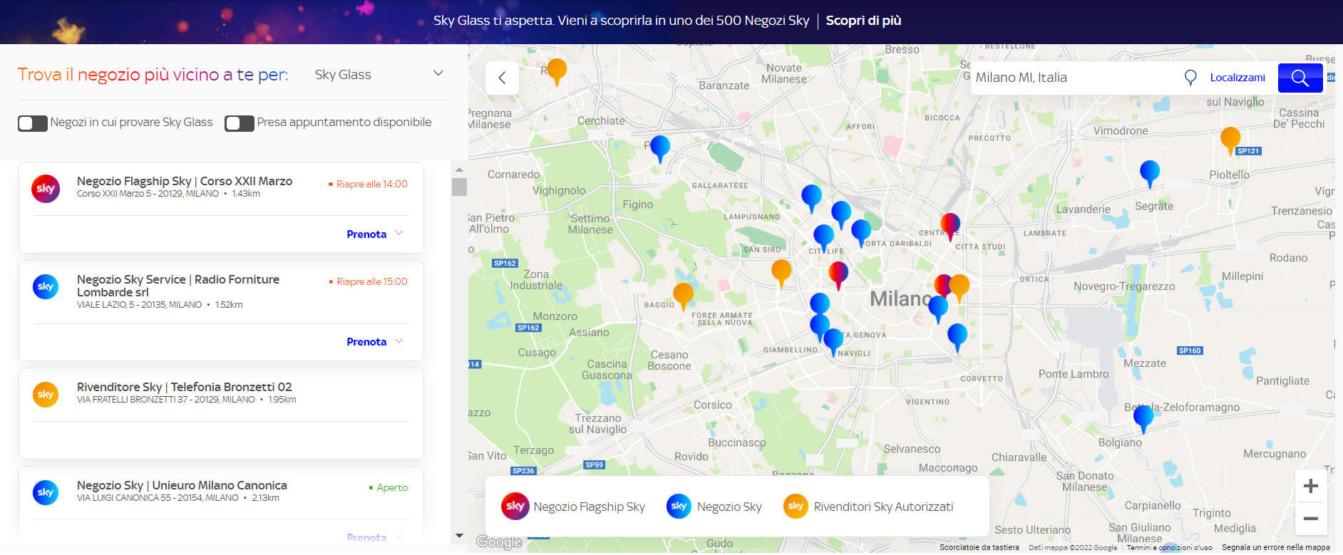 Trova Sky è lo strumento che permette agli utenti, geolocalizzandosi, di trovare il negozio che soddisfi i propri bisogni. Nato come un semplice store locator si è poi costantemente evoluto.
