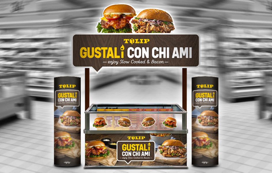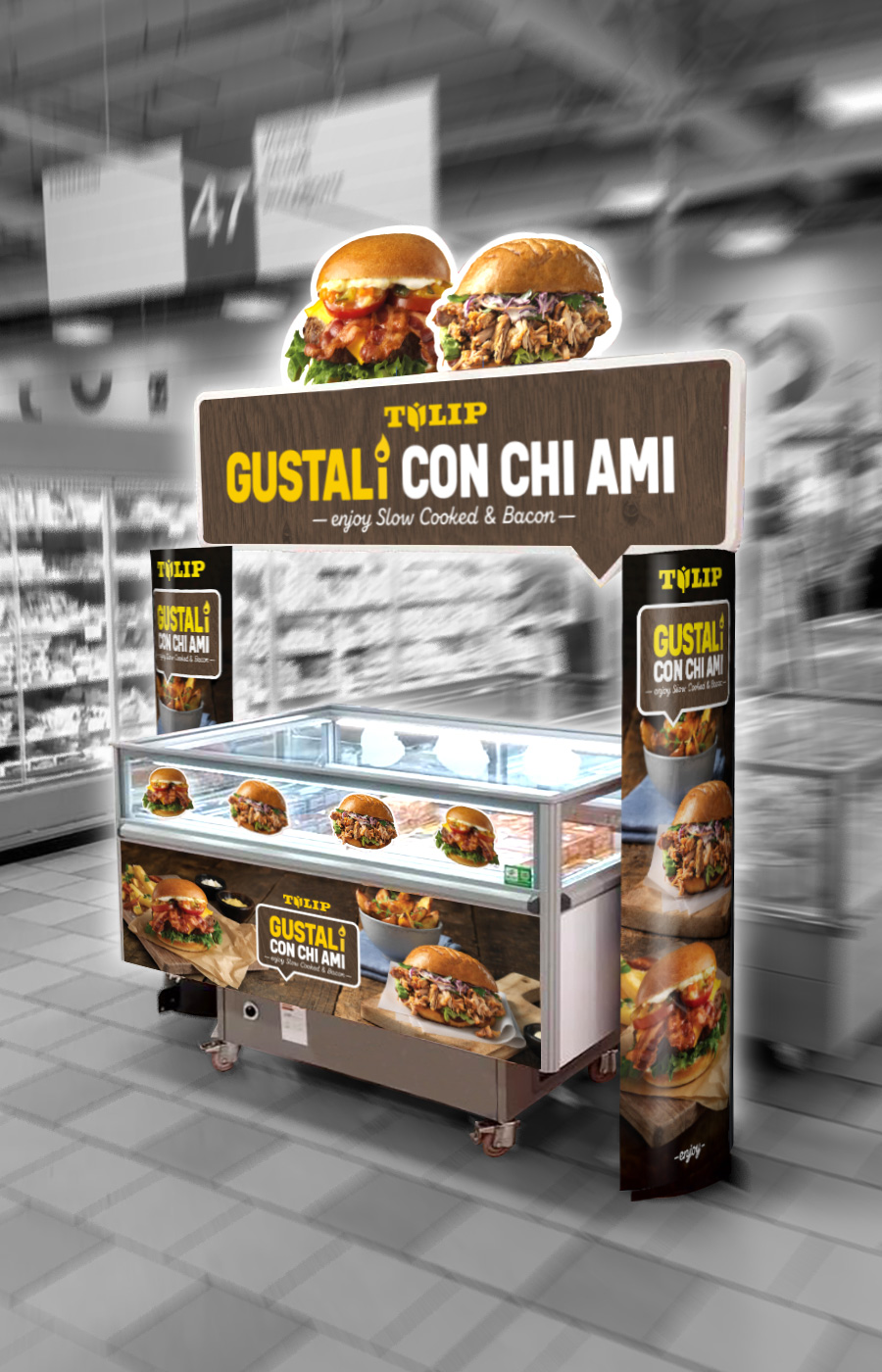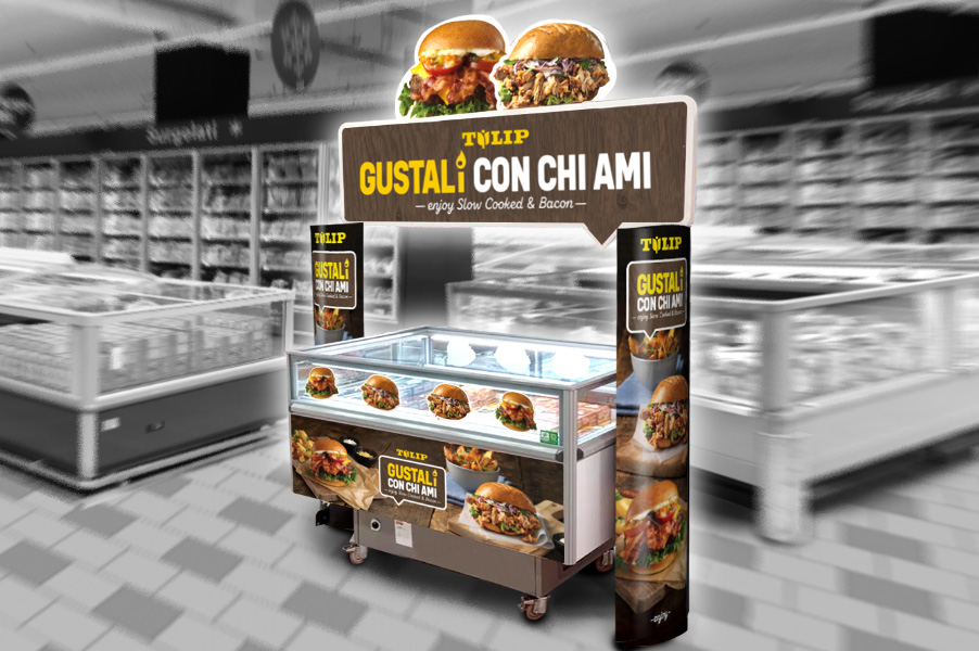 Con “Gustali con chi ami” Tulip porta una ventata di colore nei punti vendita. Il pacchetto include una vasca refrigerata dove esporre i prodotti mostrandone i colori accessi, contornata da stickers raffiguranti hamburger e panino pulled pork; a ciò si aggiunge un crowner fustellato ad altezza occhi completato da due display ovali utili a coprire i lati della vasca ma anche ad aumentare in modo netto la visibilità. L’obiettivo è quello di attrarre il consumatore tramite il colore ed il crowner visibile in lontananza, incrementando i trial di questi prodotti e generando valore per una categoria spesso parca di innovazione.